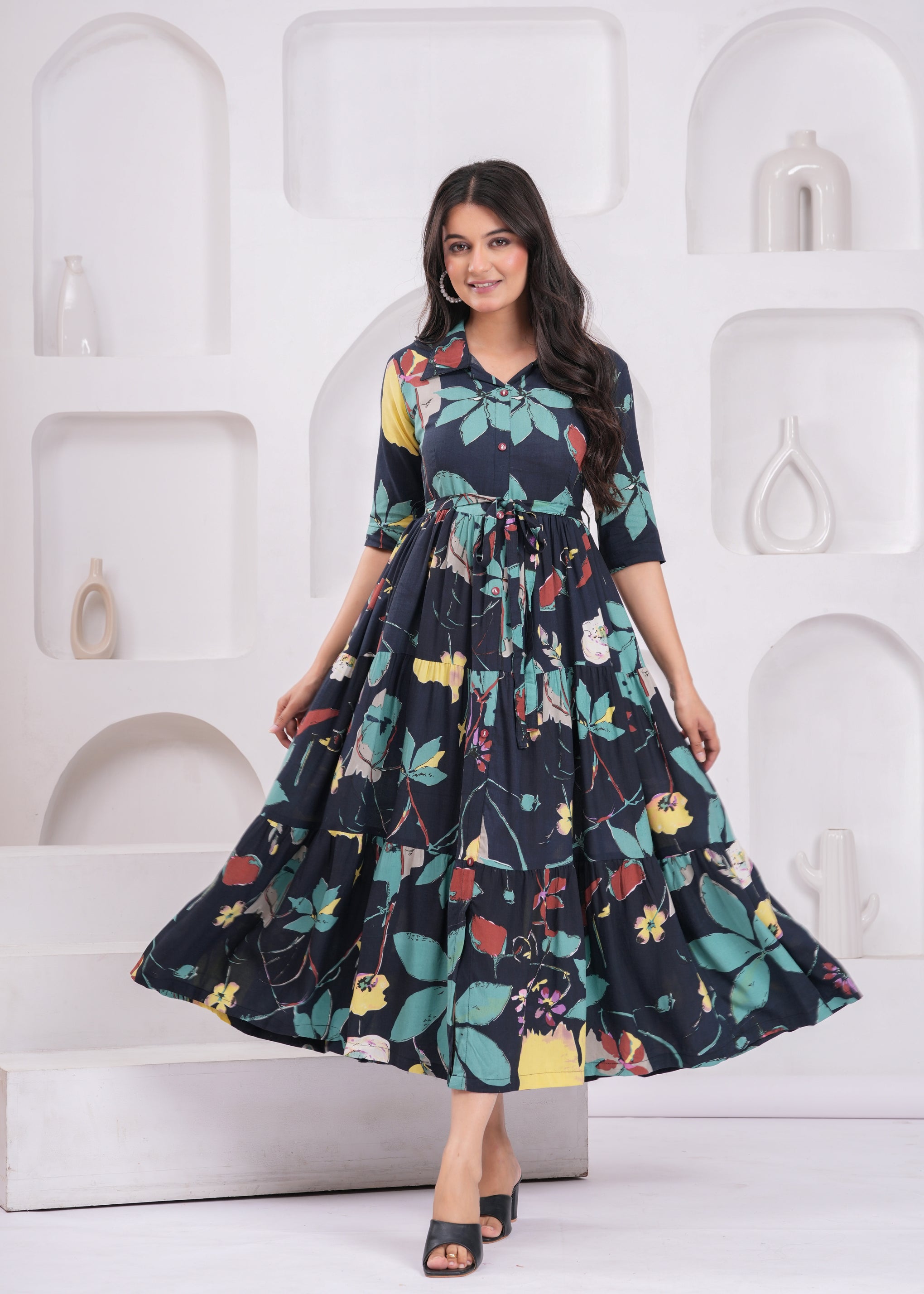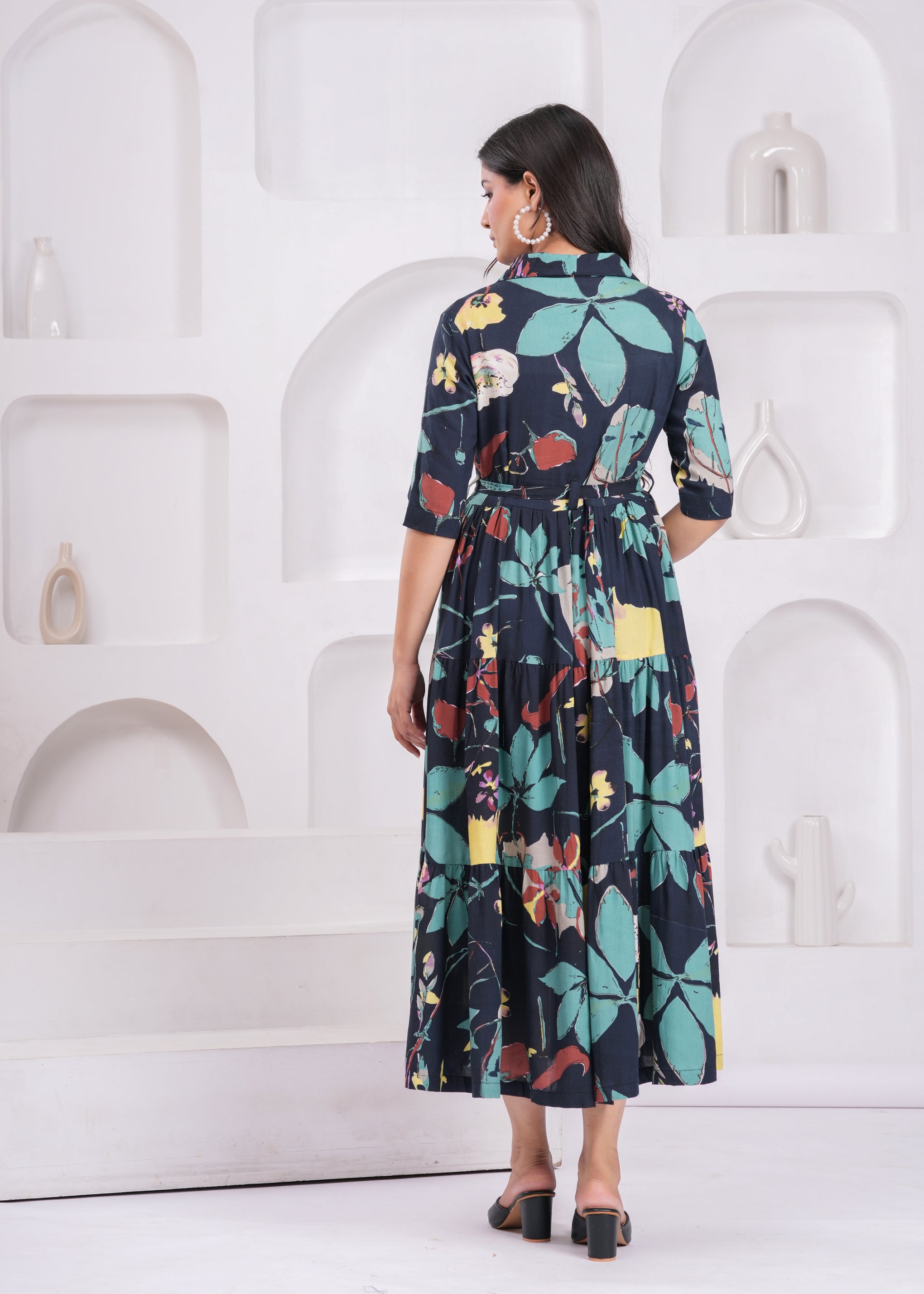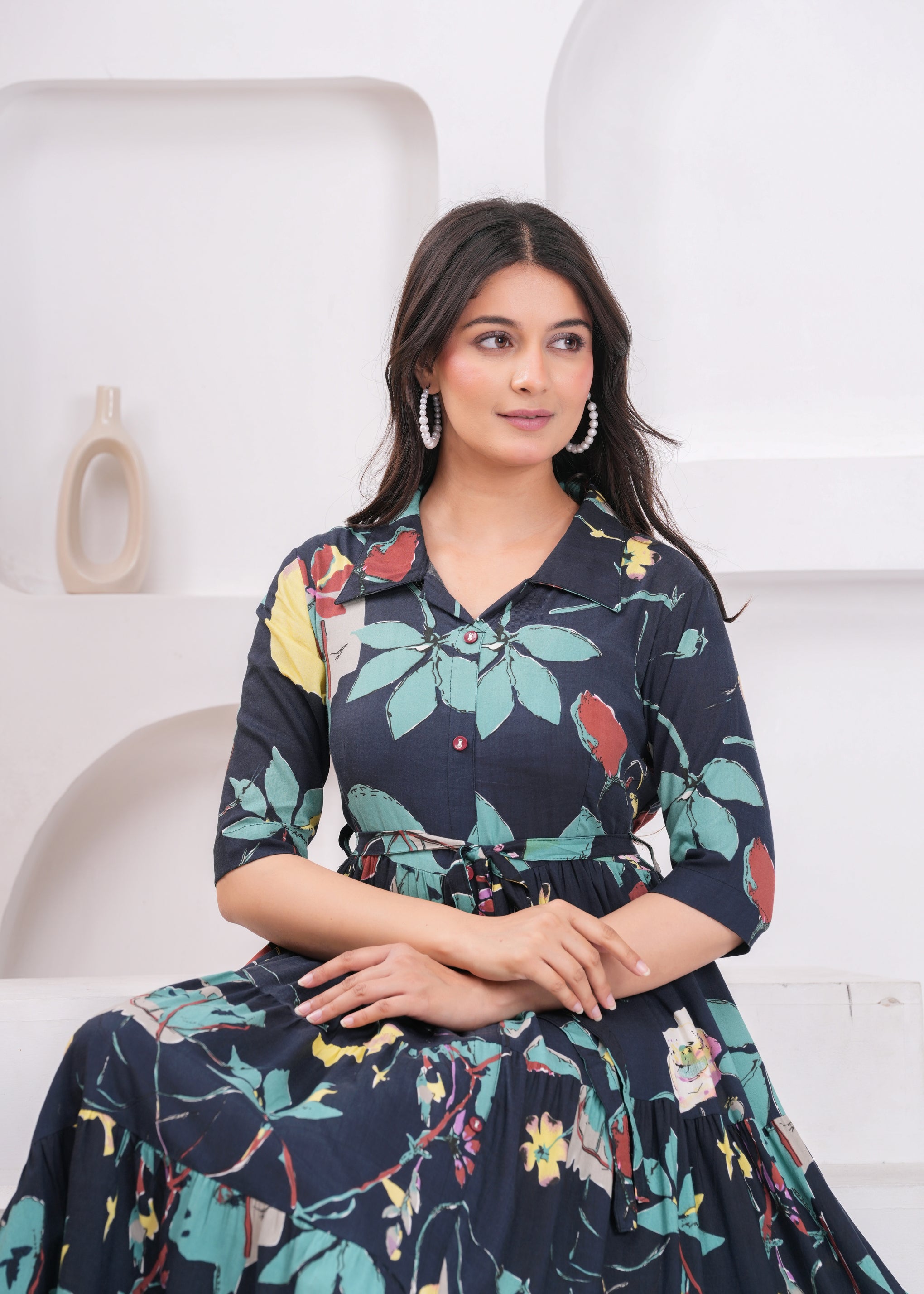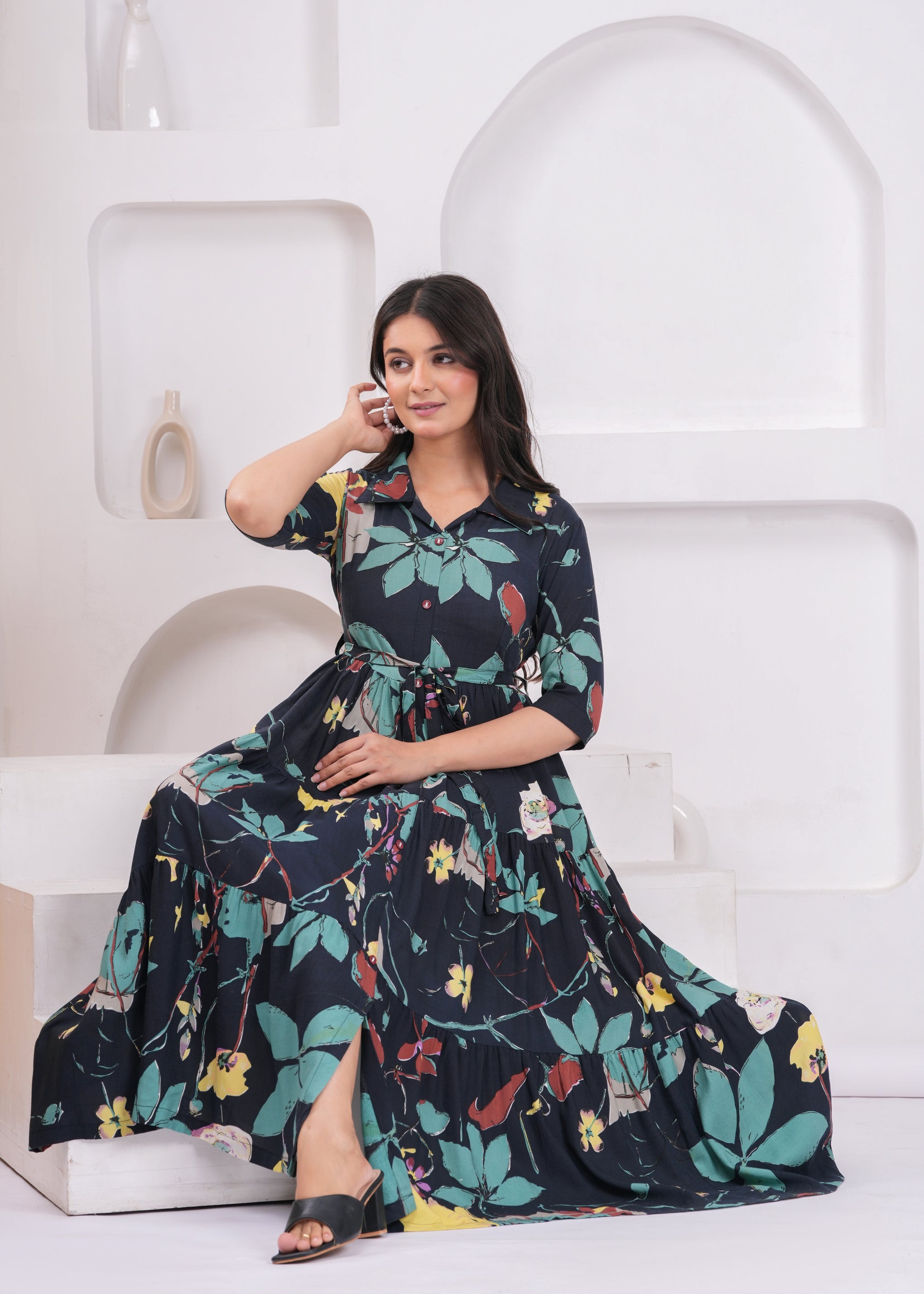 Key Features• All-over floral printed design• Fit and flare silhouette for elegant shape• Shirt collar with front button closure• Waist tie-up belt for adjustable fit• Tiered maxi length for graceful movement