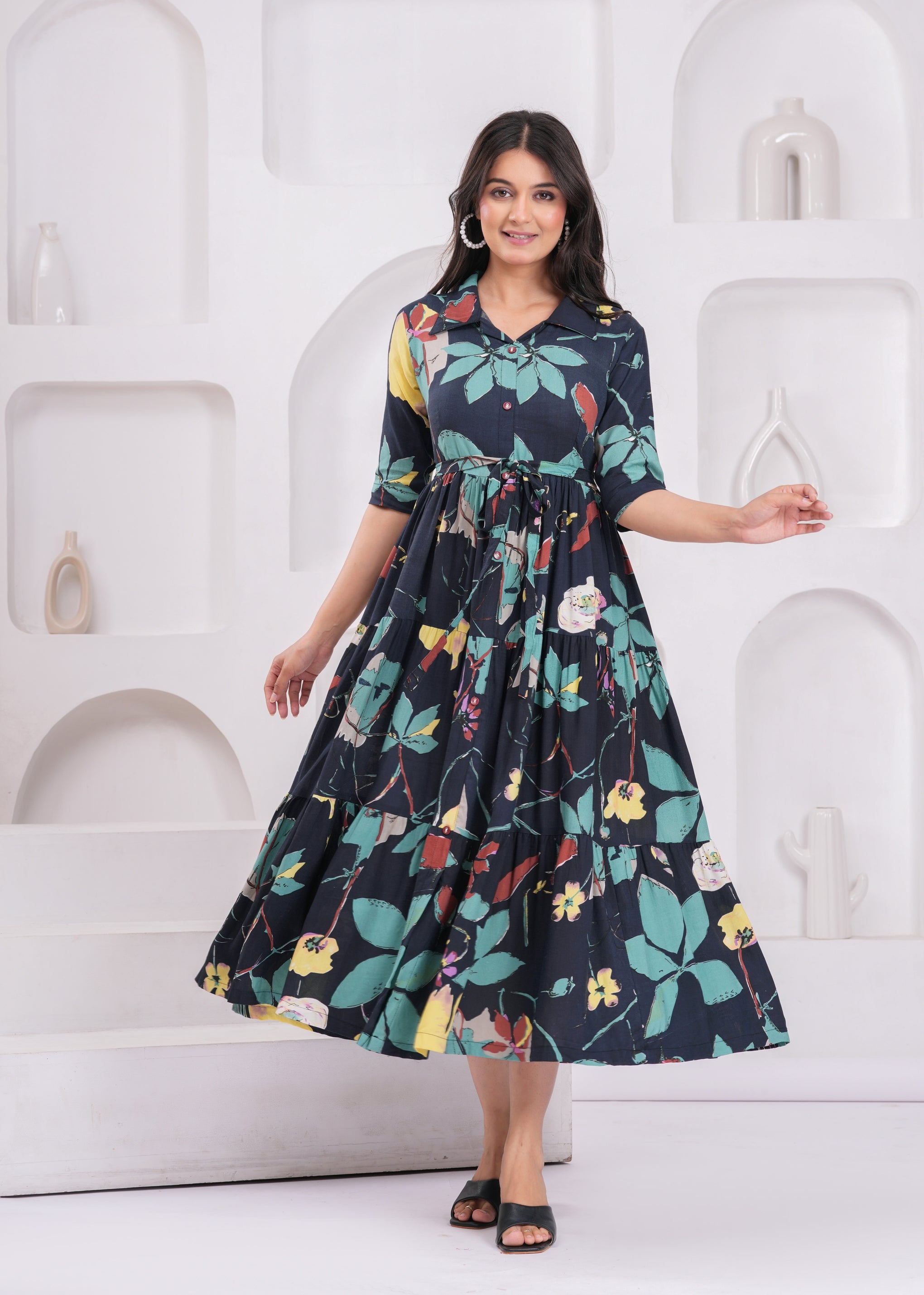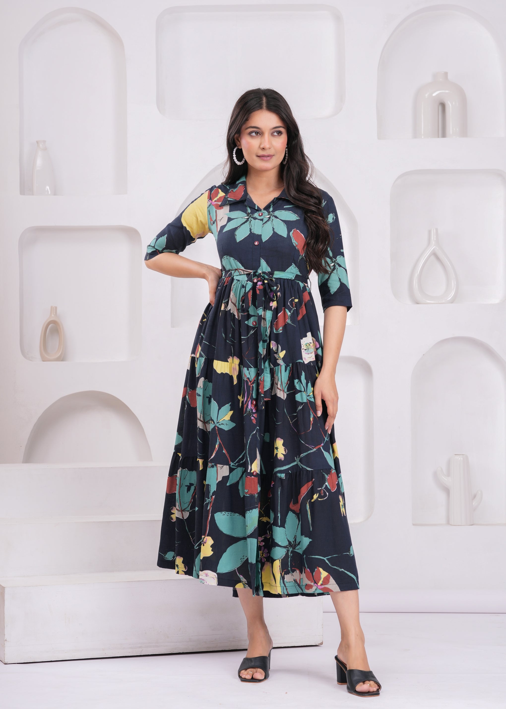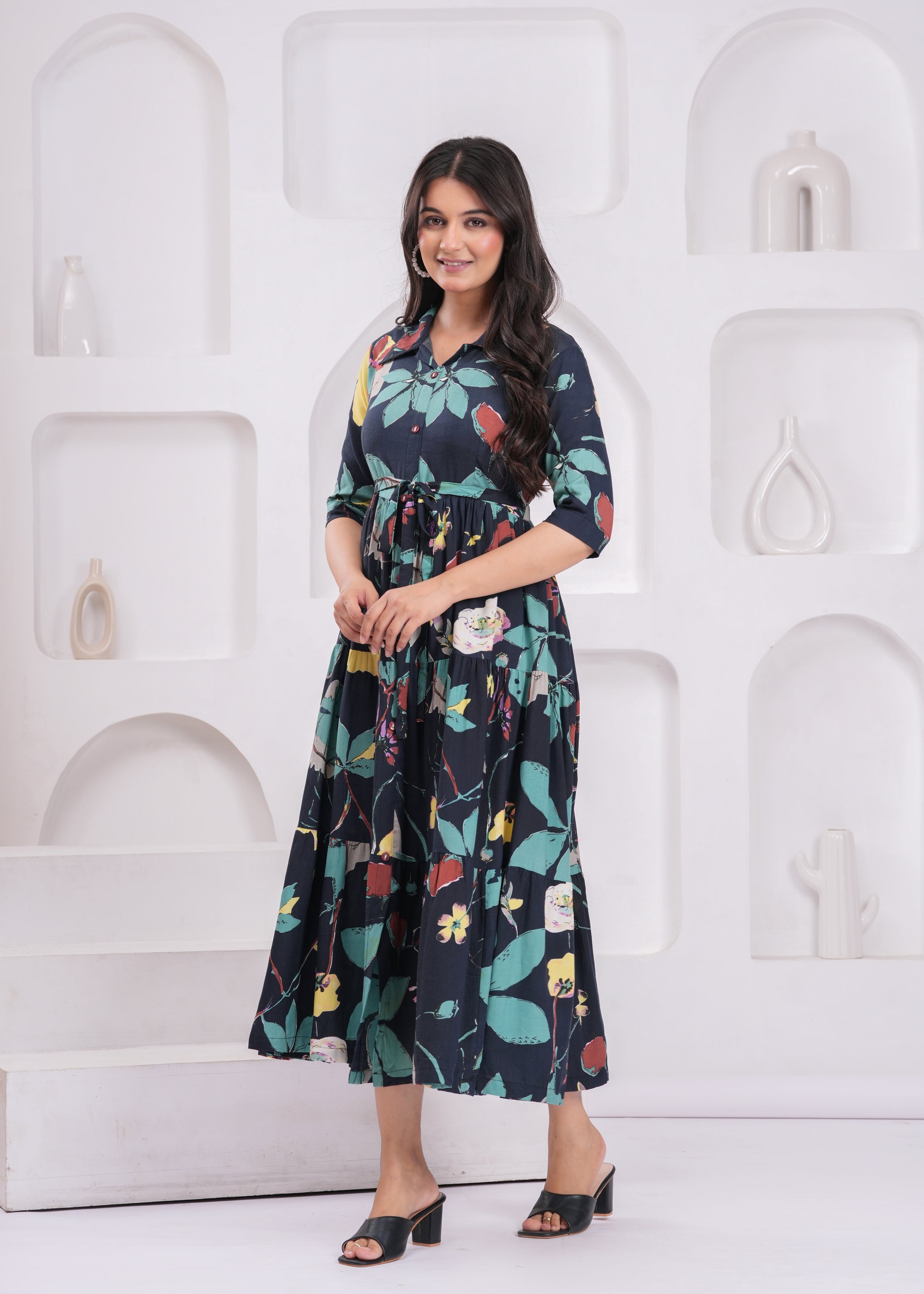 A stylish fit and flare maxi dress featuring elegant floral prints that bring a fresh and graceful look. Designed with a shirt-style collar and a flattering waist tie, it creates a beautiful flowing silhouette perfect for casual outings or daytime events.