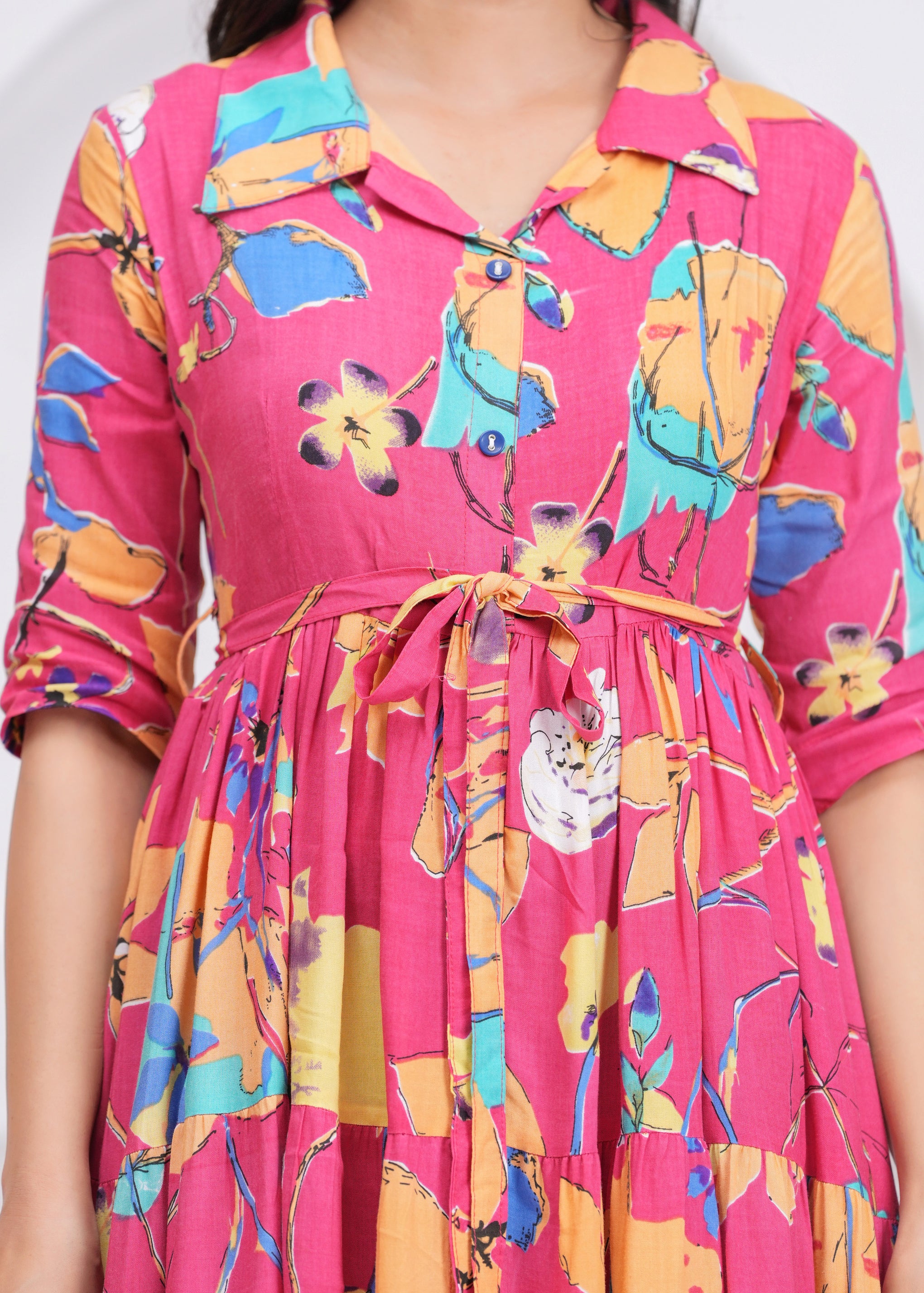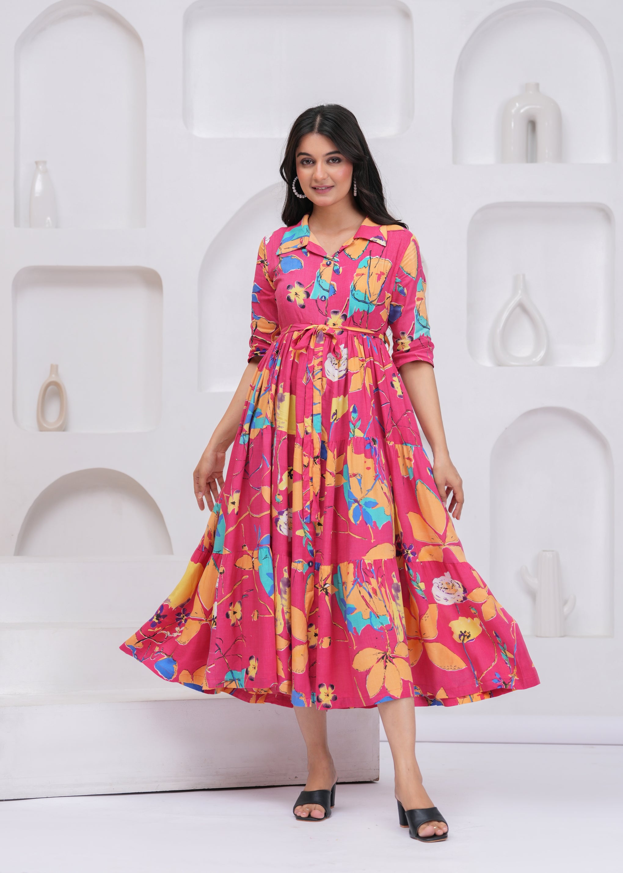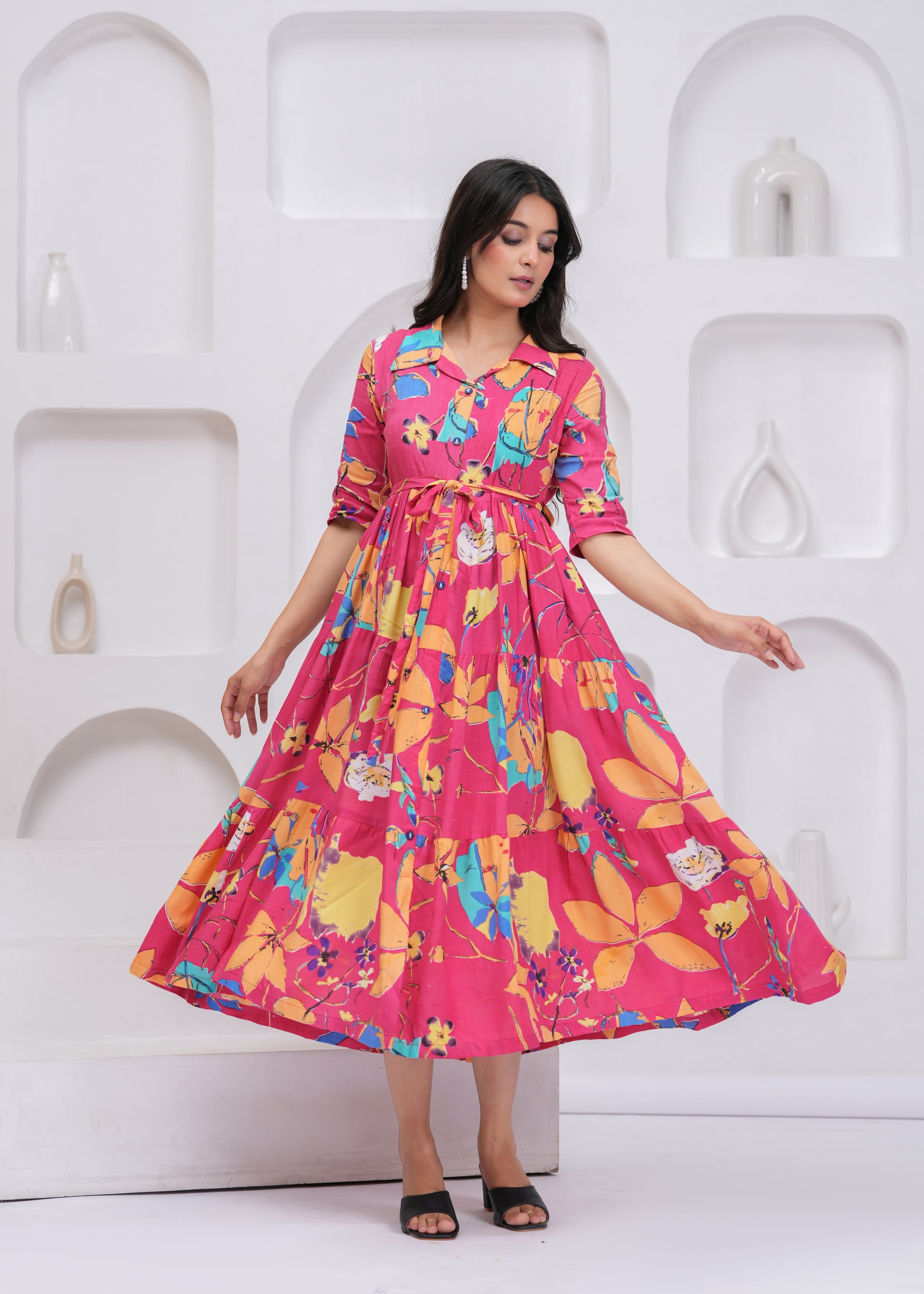 Key Features• All-over floral printed design• Fit and flare silhouette for flattering shape• Shirt collar with front button closure• Adjustable waist belt for better fit• Tiered midi length for graceful movement