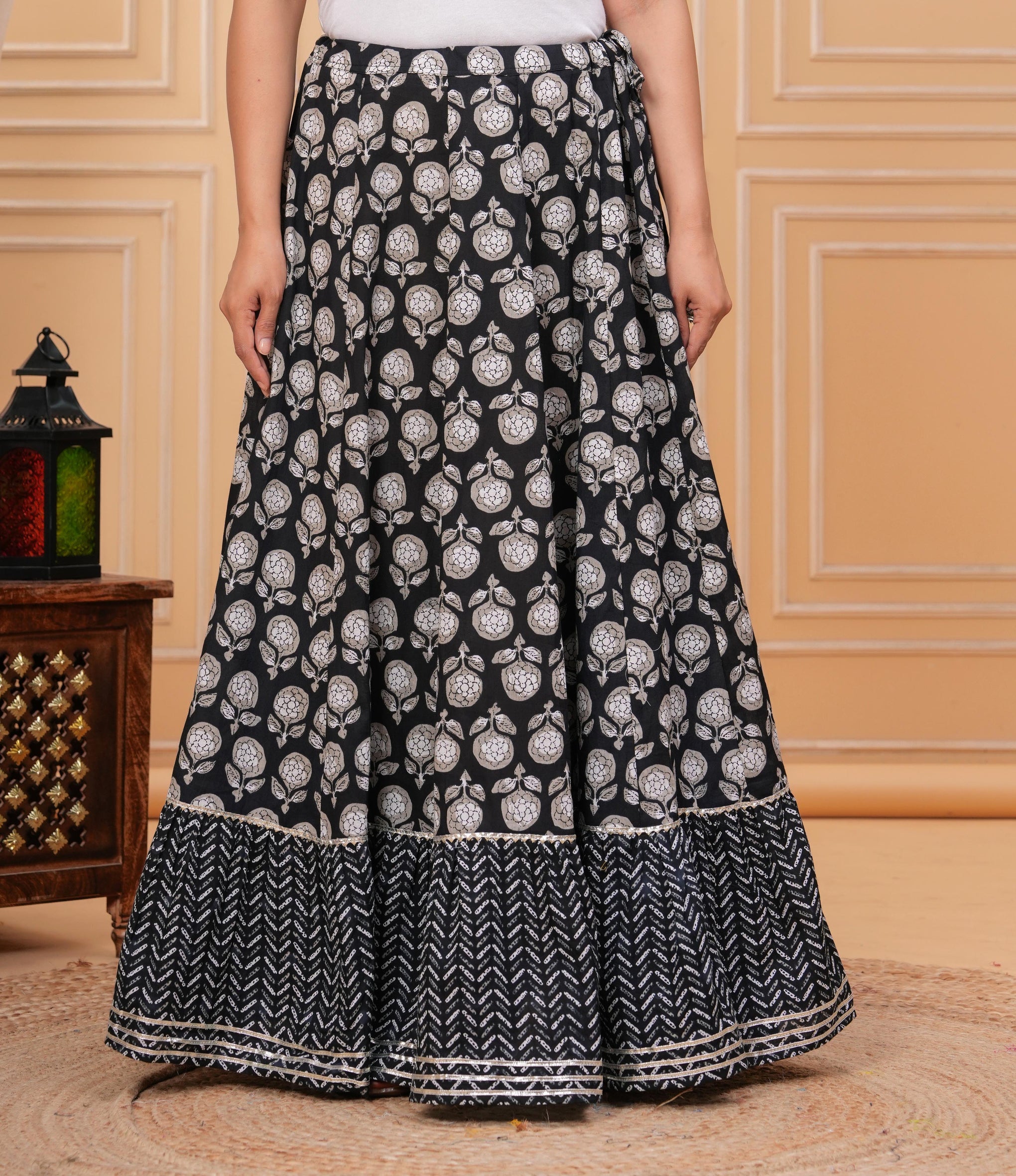 A graceful long skirt featuring elegant floral block prints that add a timeless ethnic charm. Designed with a wide flared silhouette and contrasting printed border, it creates a beautiful flow with every movement.