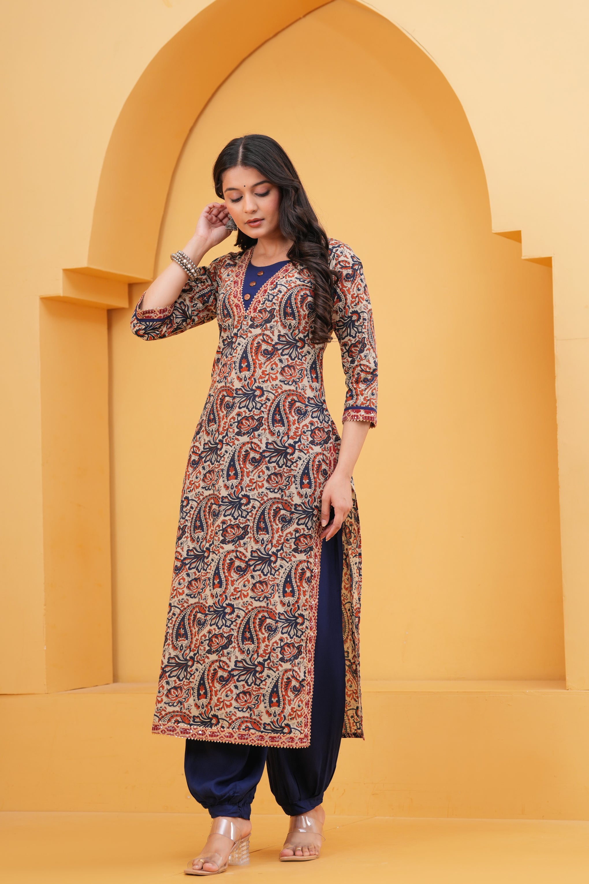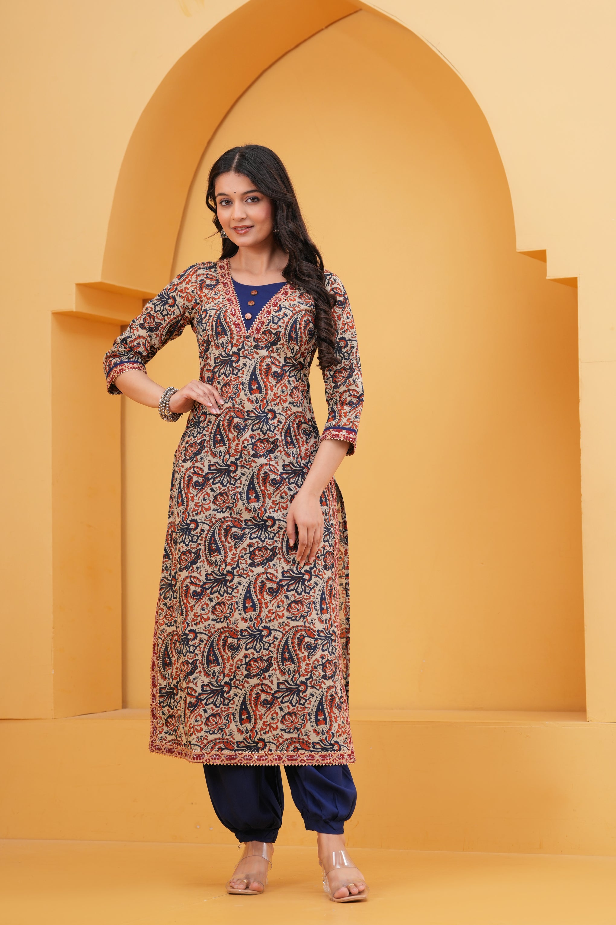This stylish kurta features intricate geometric-inspired prints enhanced with delicate thread work for an elegant ethnic look. Designed with a comfortable straight silhouette, it blends traditional charm with everyday wearability.