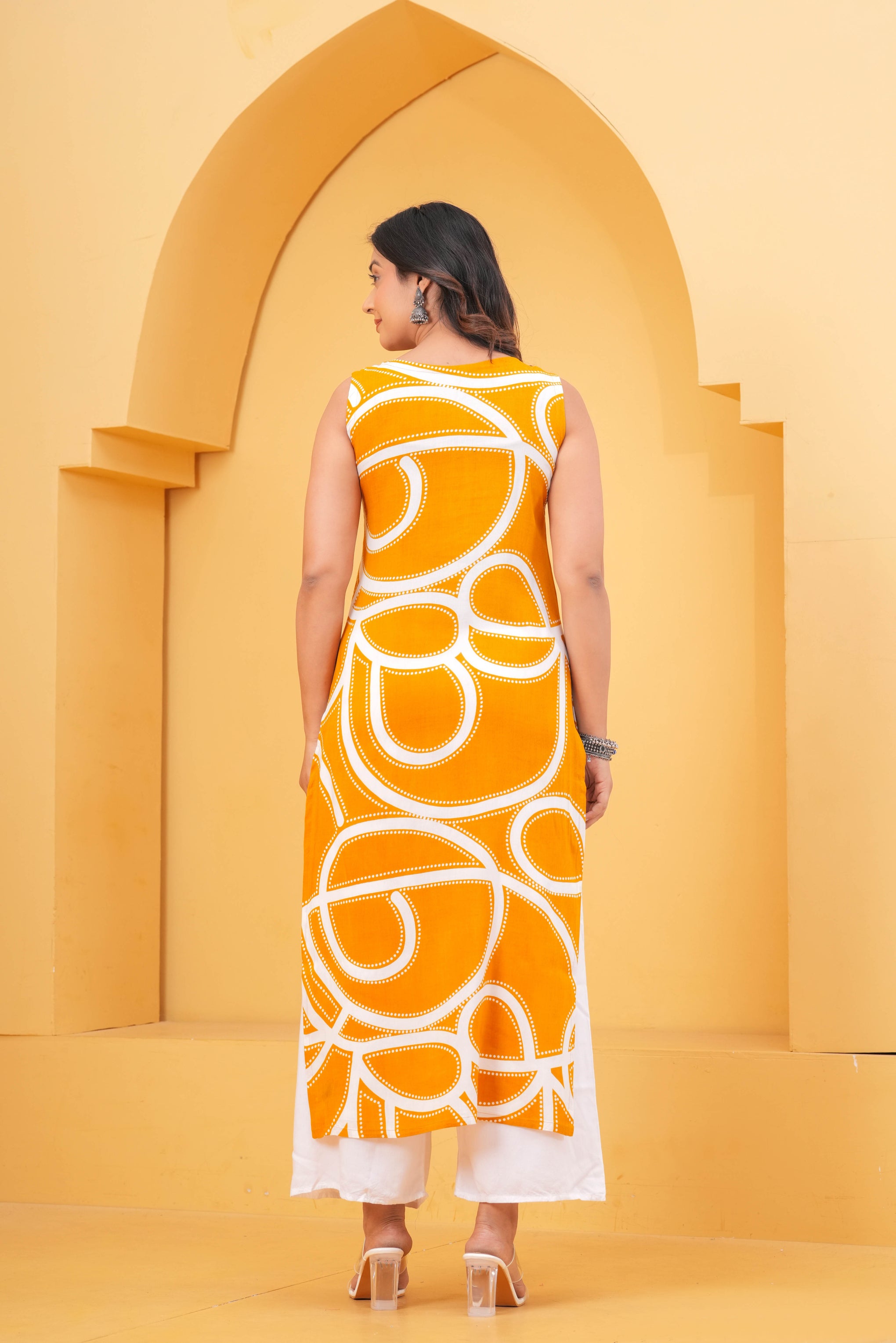 A stylish straight kurta featuring bold geometric prints that add a contemporary touch to ethnic wear. The sleeveless silhouette and clean design create a sleek and elegant look for everyday styling.