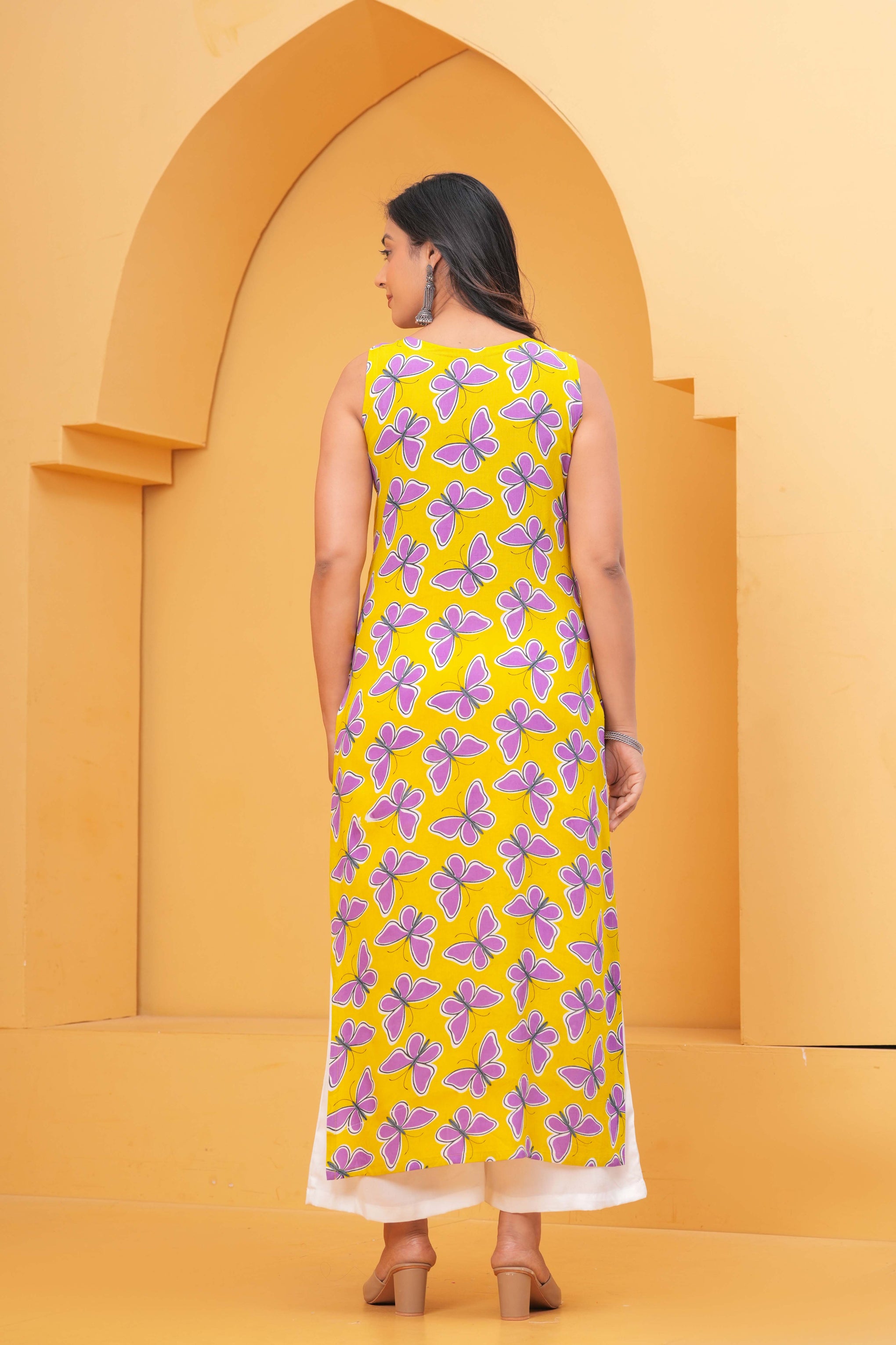 A bright and stylish sleeveless kurta featuring vibrant printed patterns that bring a playful charm to your everyday look. Crafted from breathable cotton, it offers a comfortable fit and effortless style perfect for casual outings and daily wear.
