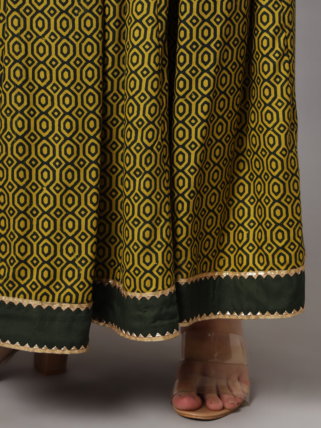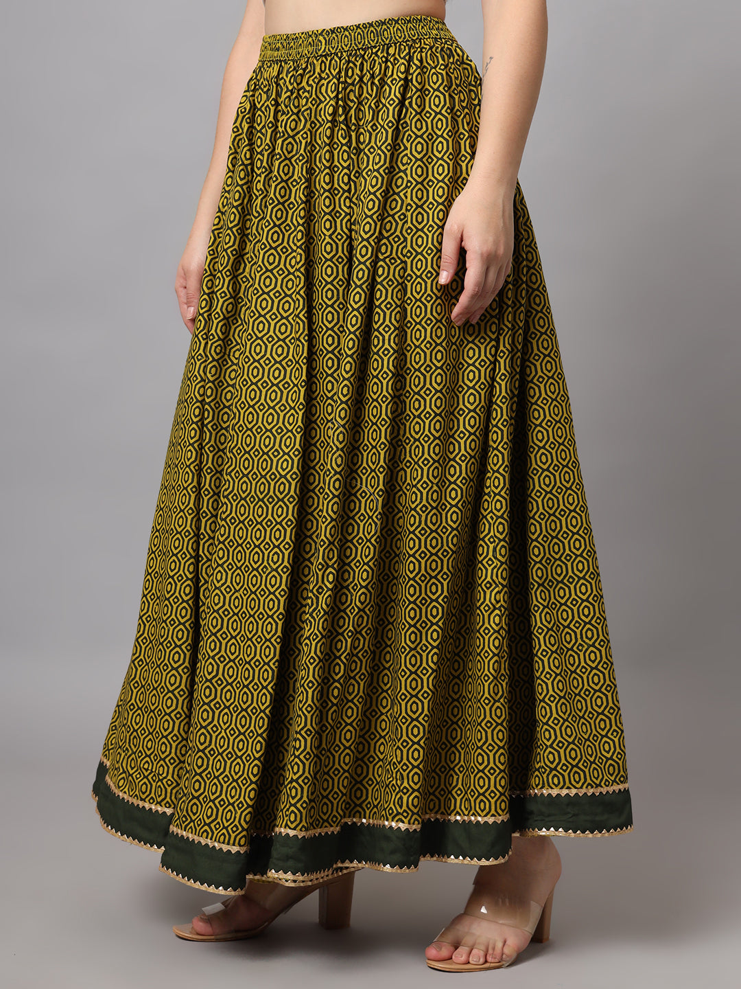 A stylish green maxi skirt featuring an all-over geometric printed pattern and a graceful flared silhouette. Designed with an elasticated waistband for a comfortable fit and finished with a contrasting border at the hem, this skirt brings a perfect blend of ethnic charm and everyday comfort.