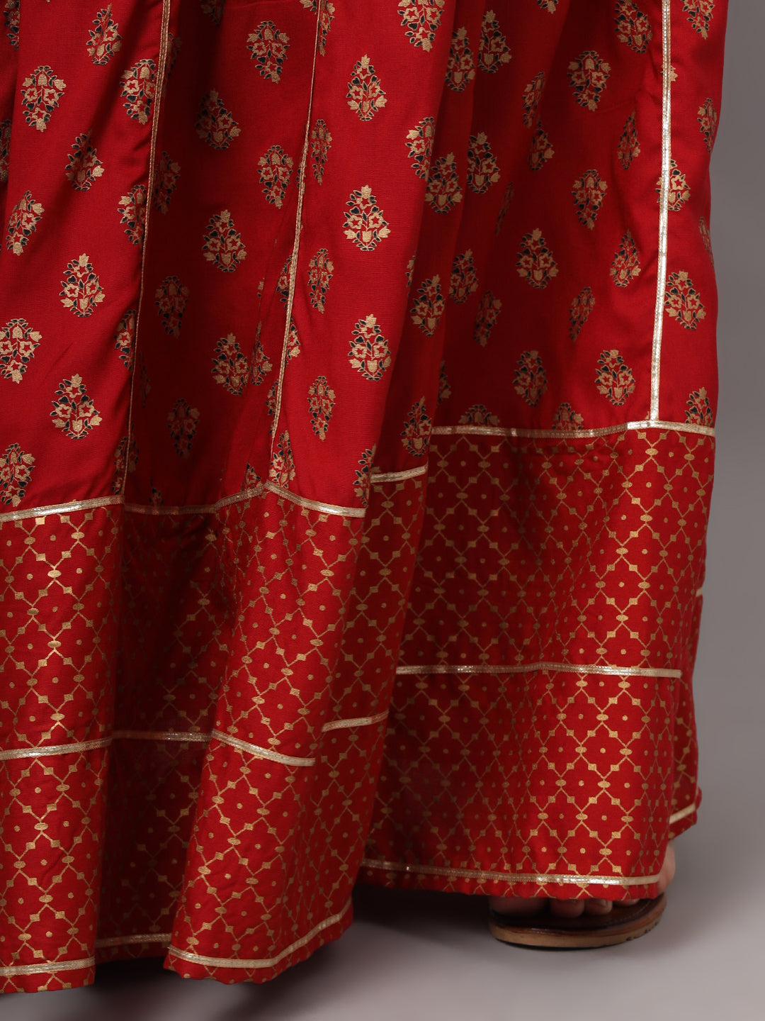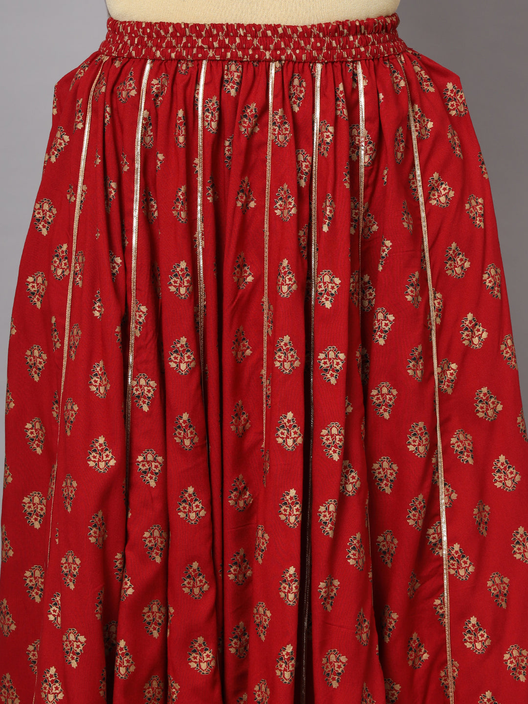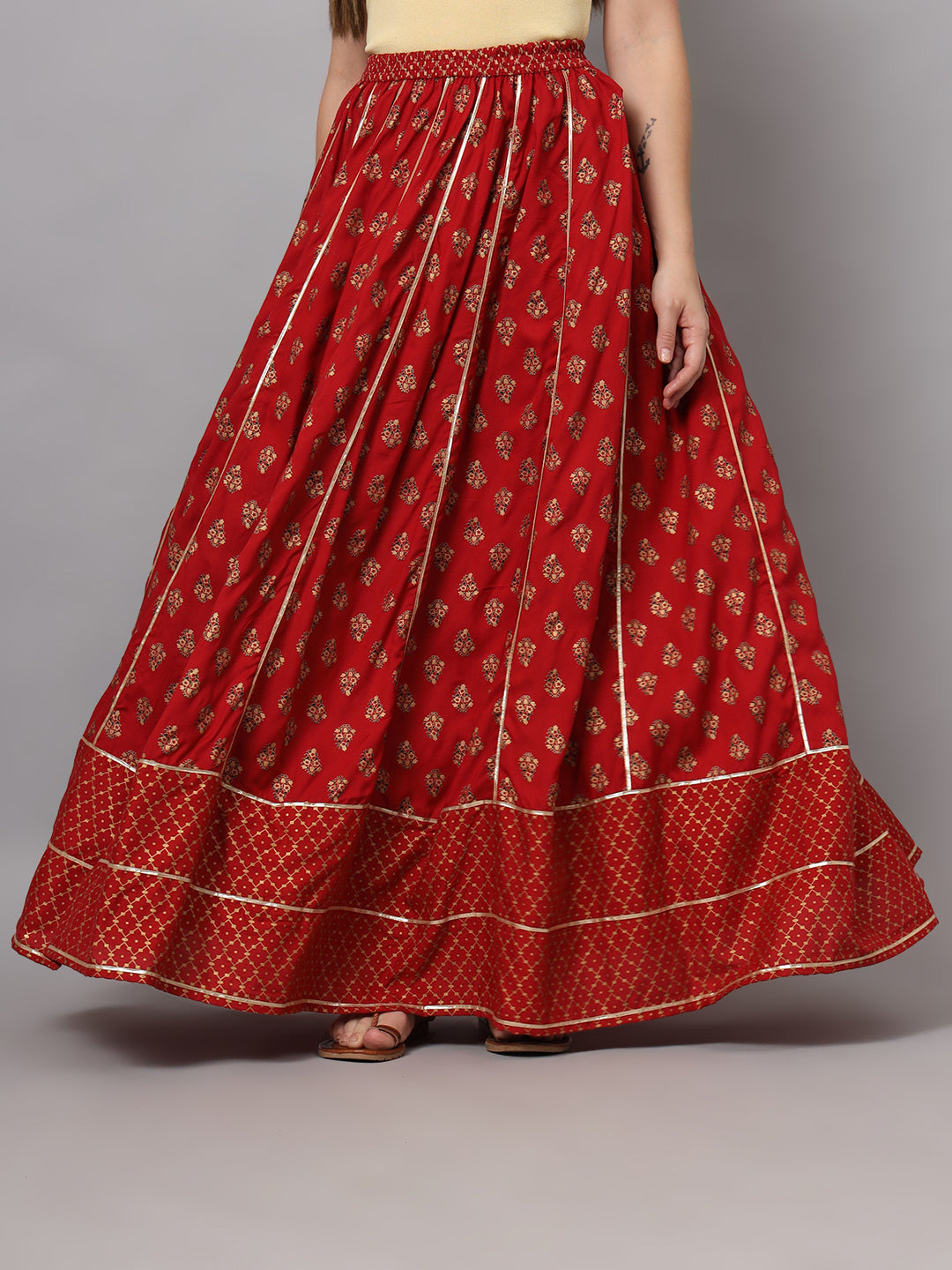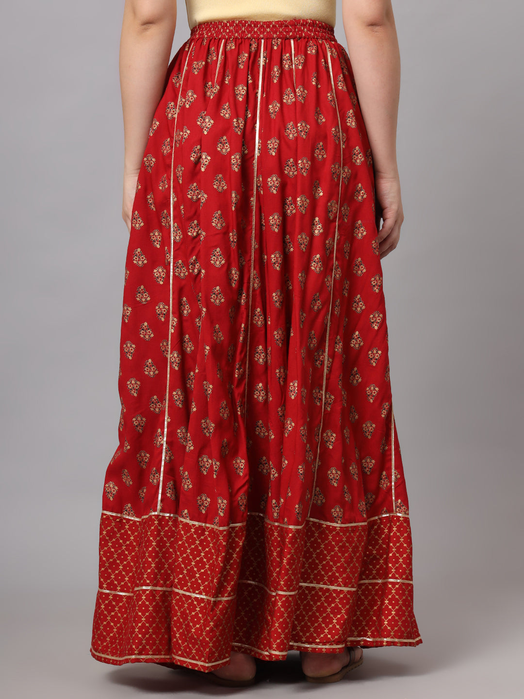 An elegant Maroon maxi skirt designed with all-over traditional prints and a beautifully flared silhouette. Featuring an elasticated waistband for a comfortable fit and a contrasting ethnic border at the hem, this skirt adds a graceful touch to festive and casual ethnic looks.