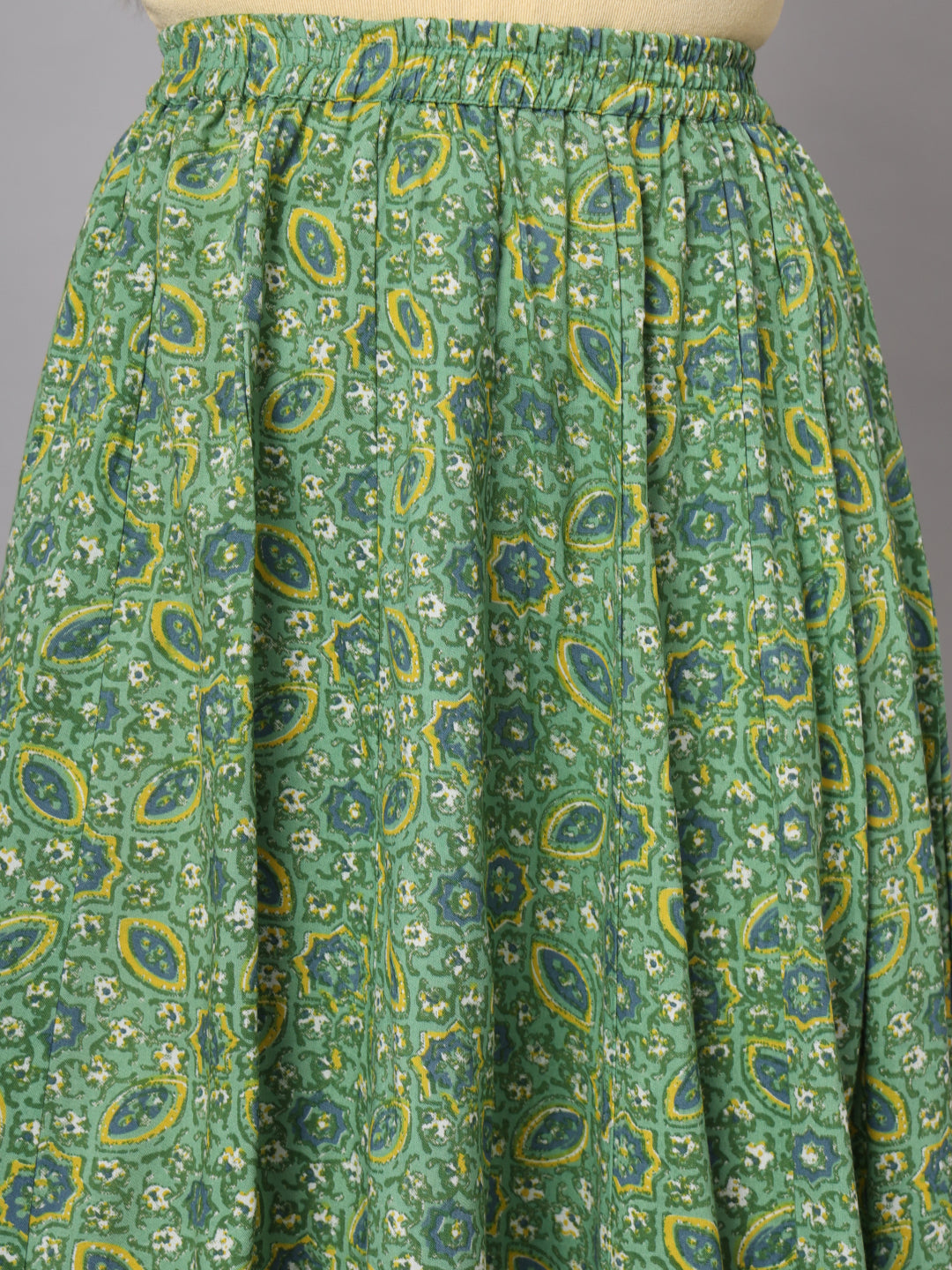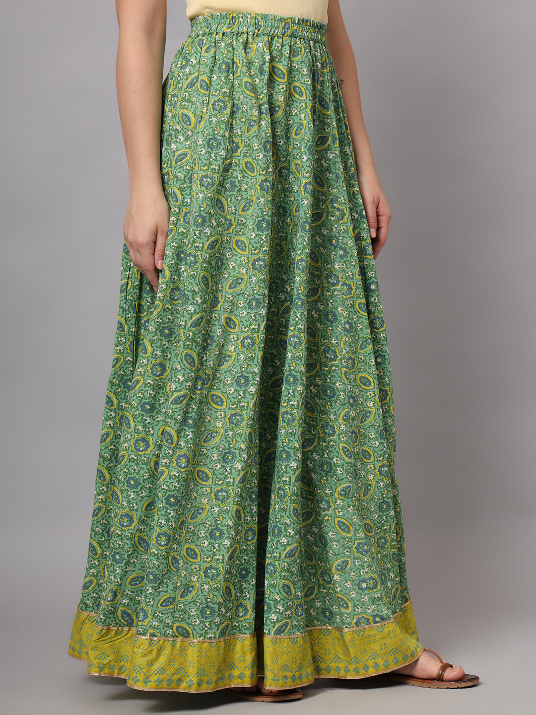 A graceful pista green maxi skirt featuring an all-over printed design and a beautifully flared silhouette. Designed with an elasticated waistband for a comfortable fit, it is finished with a contrasting border at the hem that adds a subtle ethnic charm, making it perfect for everyday and festive styling.