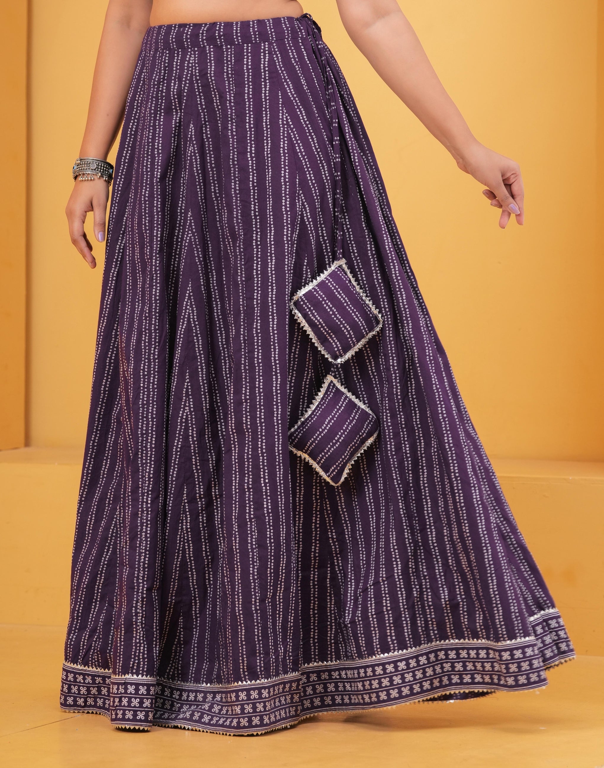 A graceful flared maxi skirt featuring elegant stripe-inspired ethnic prints that add a timeless traditional appeal. The flowing silhouette and decorative border detail create a stylish look perfect for festive and casual wear.