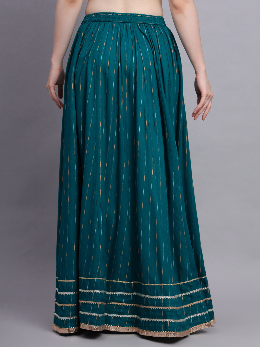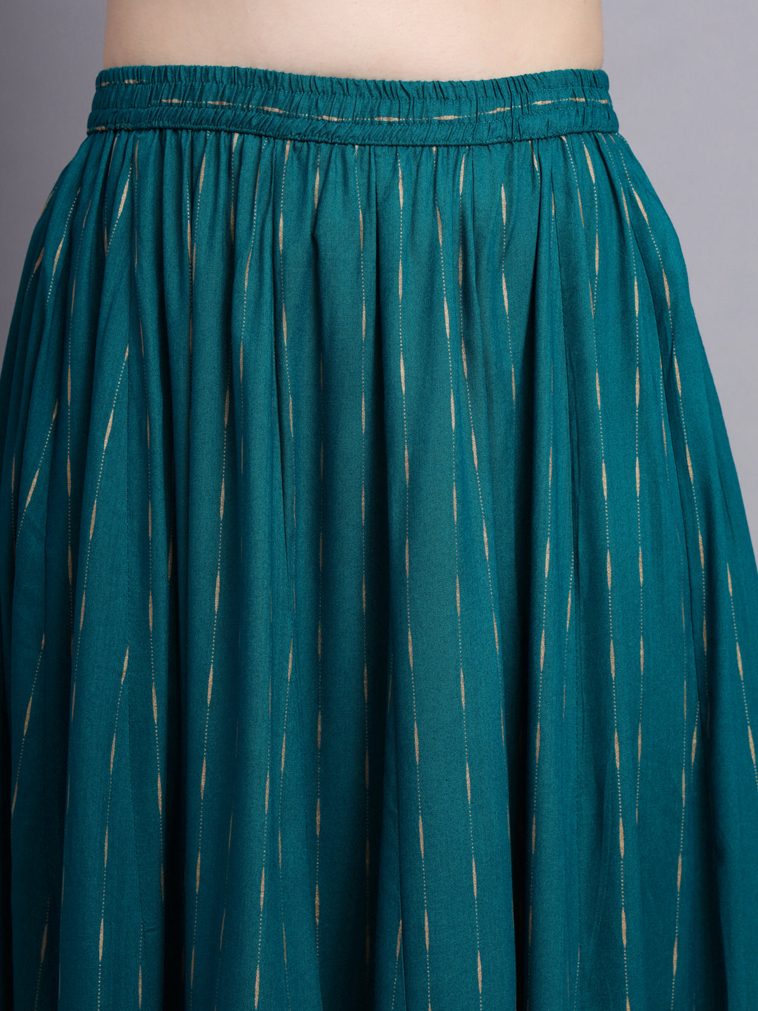 A graceful maxi skirt designed with subtle vertical stripes and a beautifully flared silhouette. Featuring an elasticated waistband and elegant border detailing at the hem, this skirt offers both comfort and style, making it perfect for festive occasions or ethnic-inspired looks.