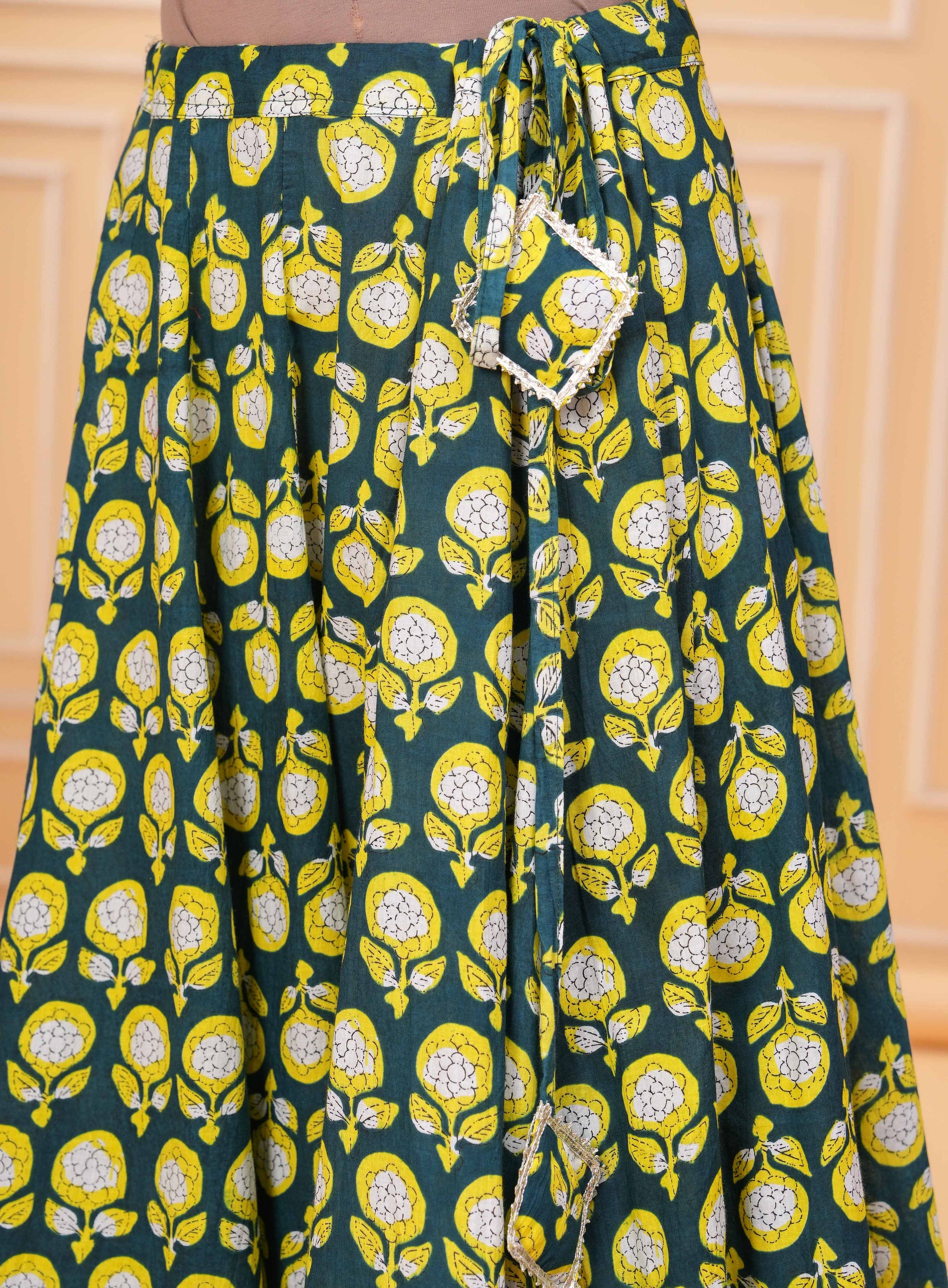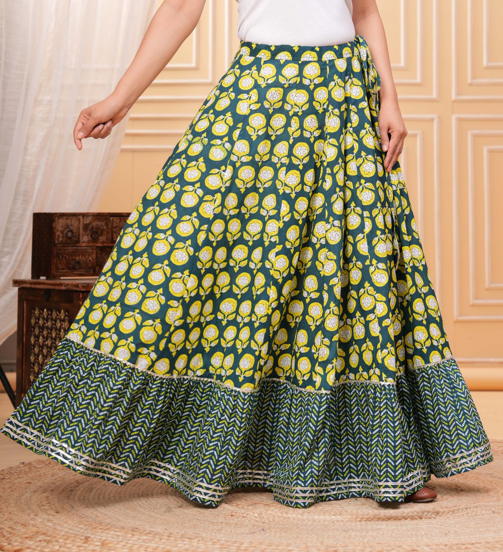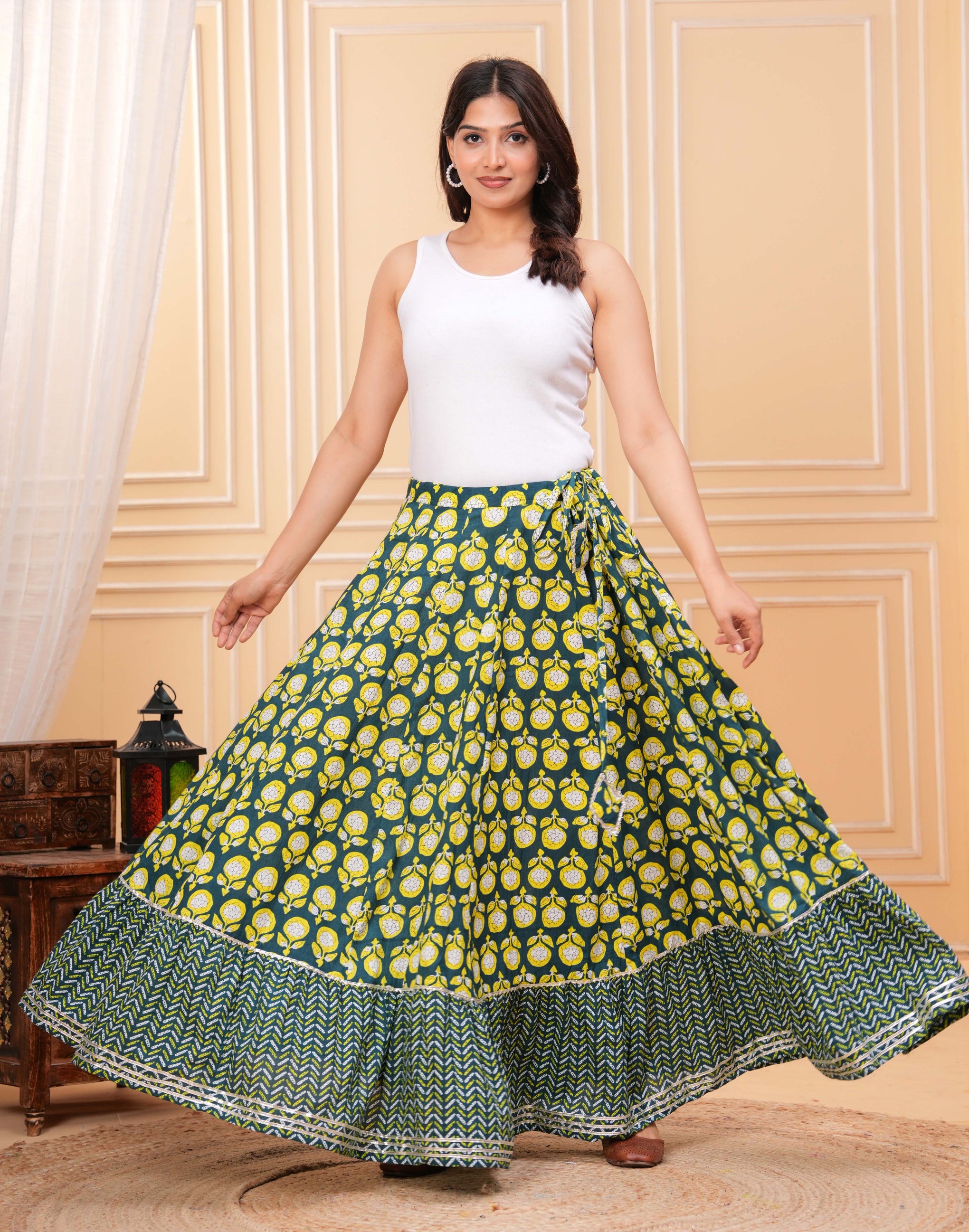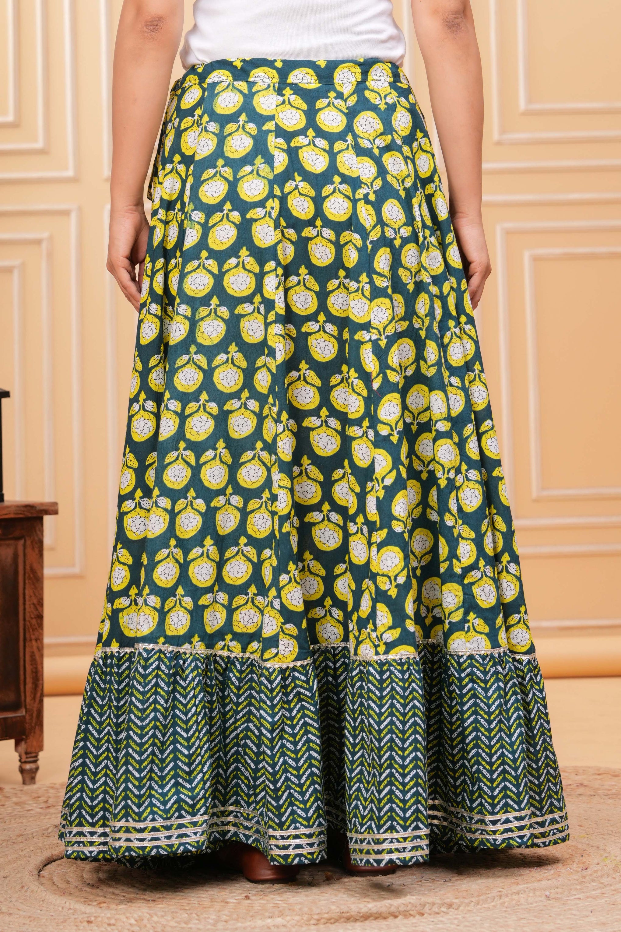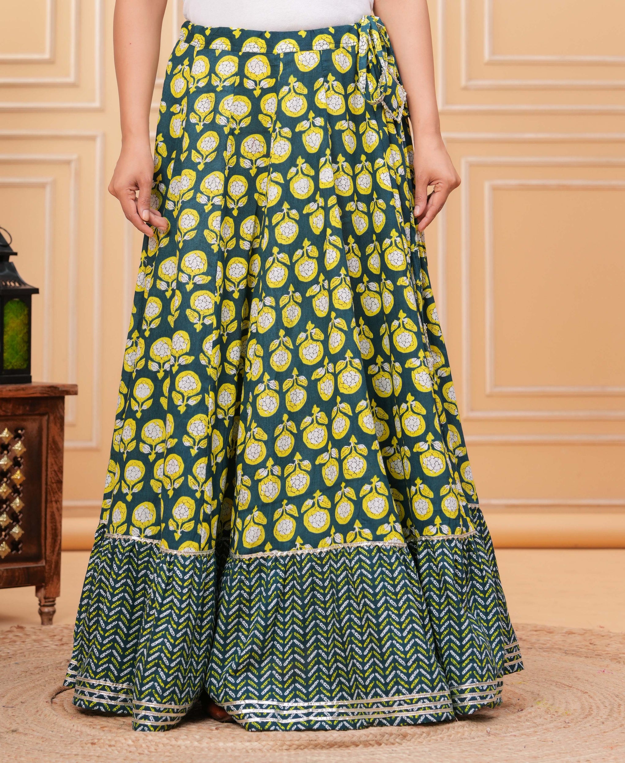 A beautifully designed maxi skirt featuring traditional prints that add a vibrant ethnic charm. The panelled construction and flared silhouette create a graceful flow, making it perfect for festive occasions and stylish casual looks.