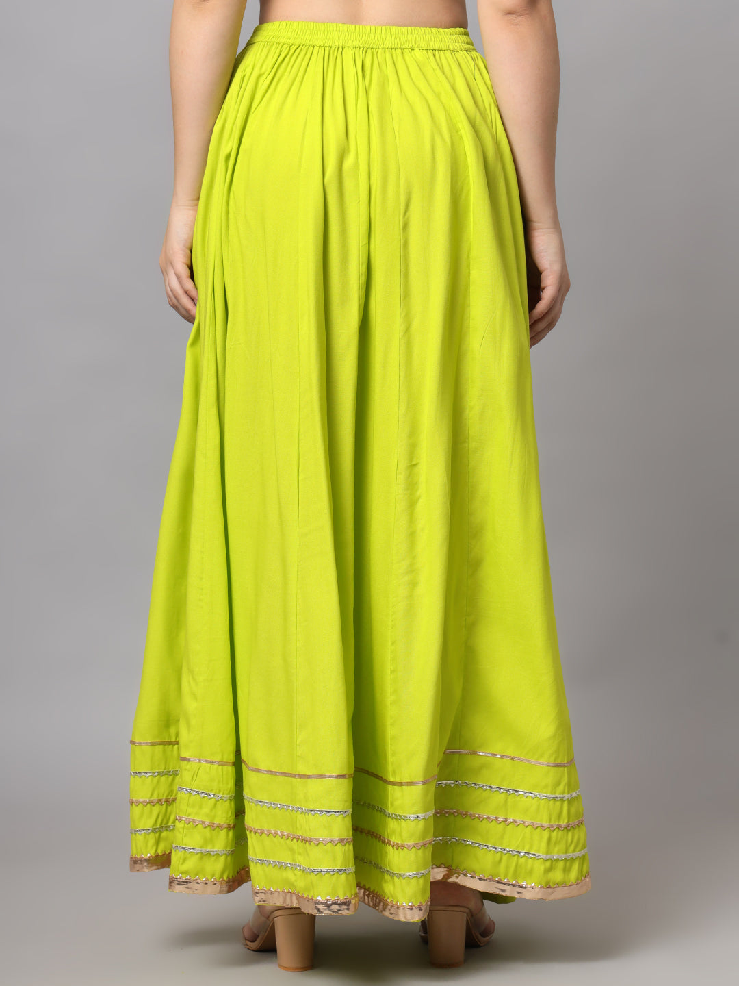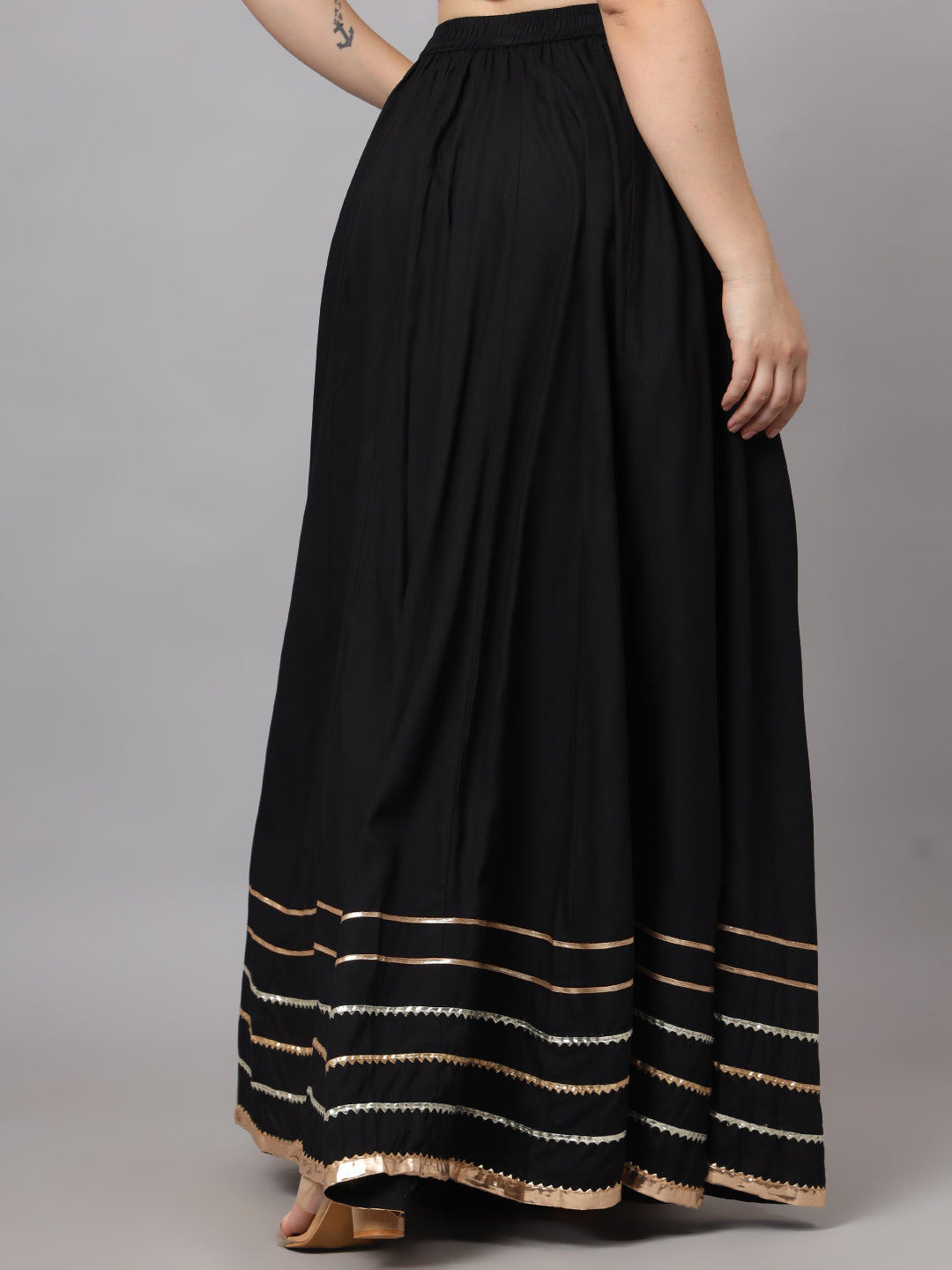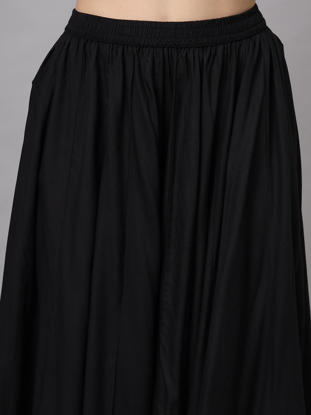 A classic black maxi skirt designed with a graceful flared silhouette and elegant border detailing at the hem. The elasticated waistband ensures a comfortable fit, while the flowy design adds effortless movement, making it perfect for festive and ethnic styling.