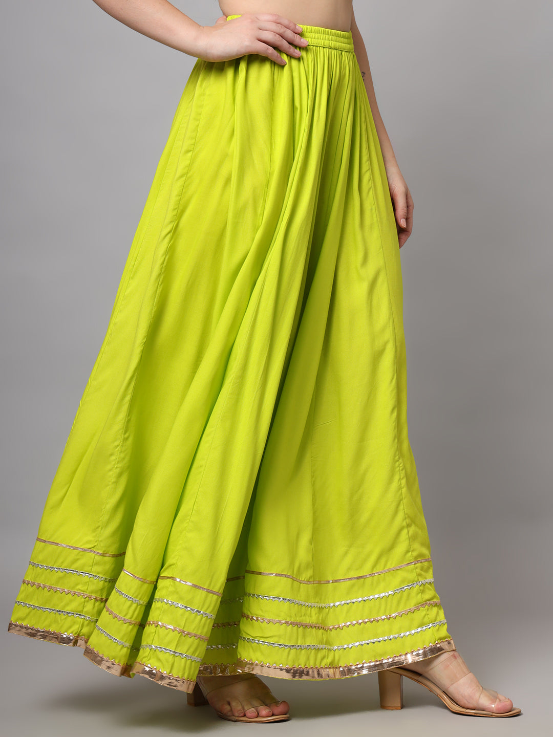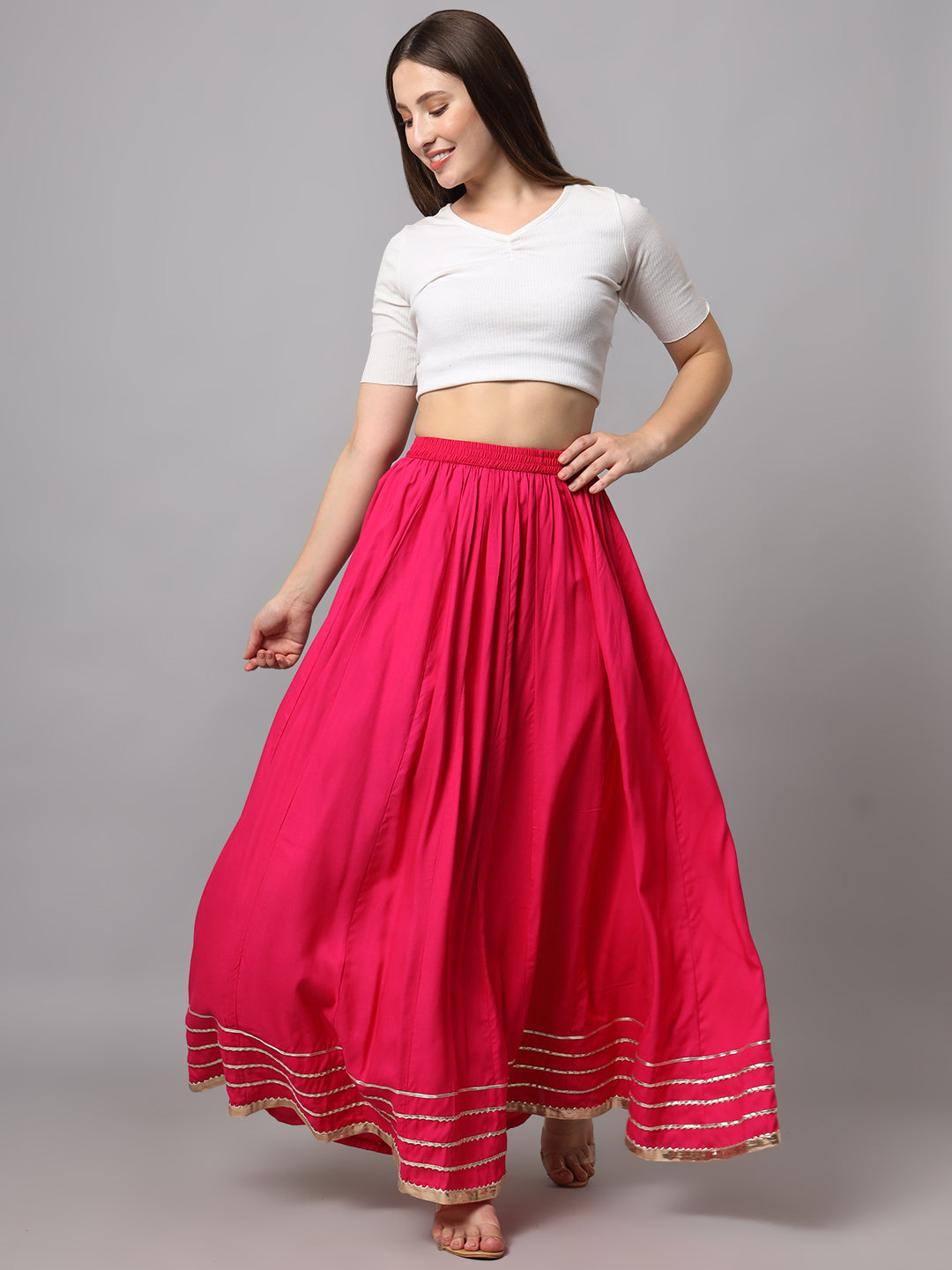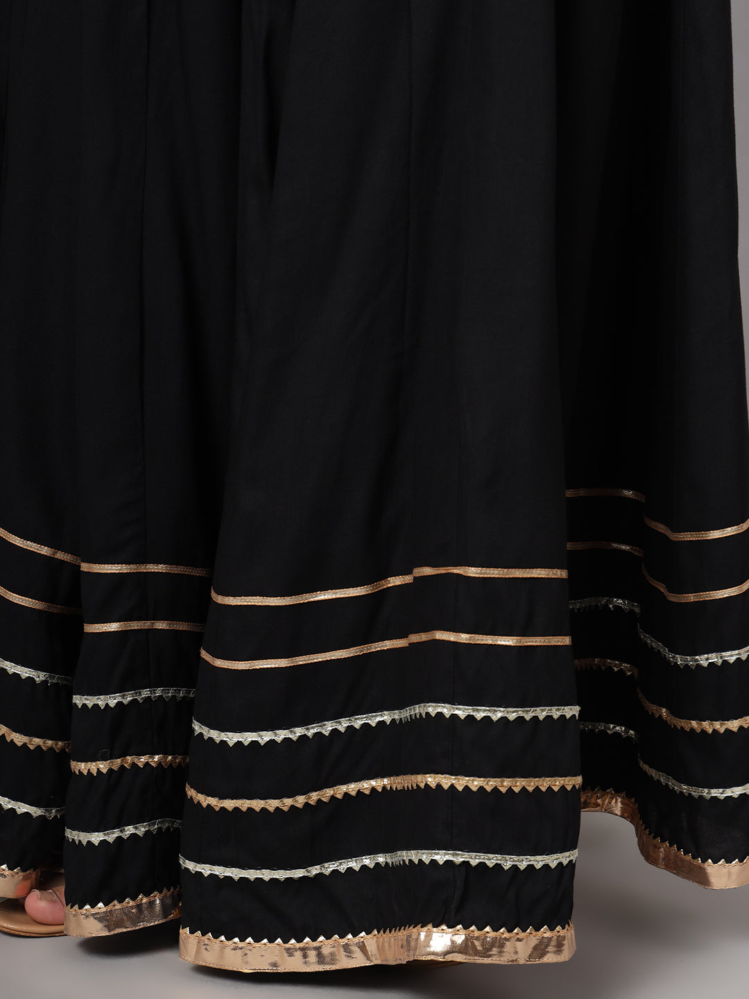 A classic black maxi skirt designed with a graceful flared silhouette and elegant border detailing at the hem. The elasticated waistband ensures a comfortable fit, while the flowy design adds effortless movement, making it perfect for festive and ethnic styling.