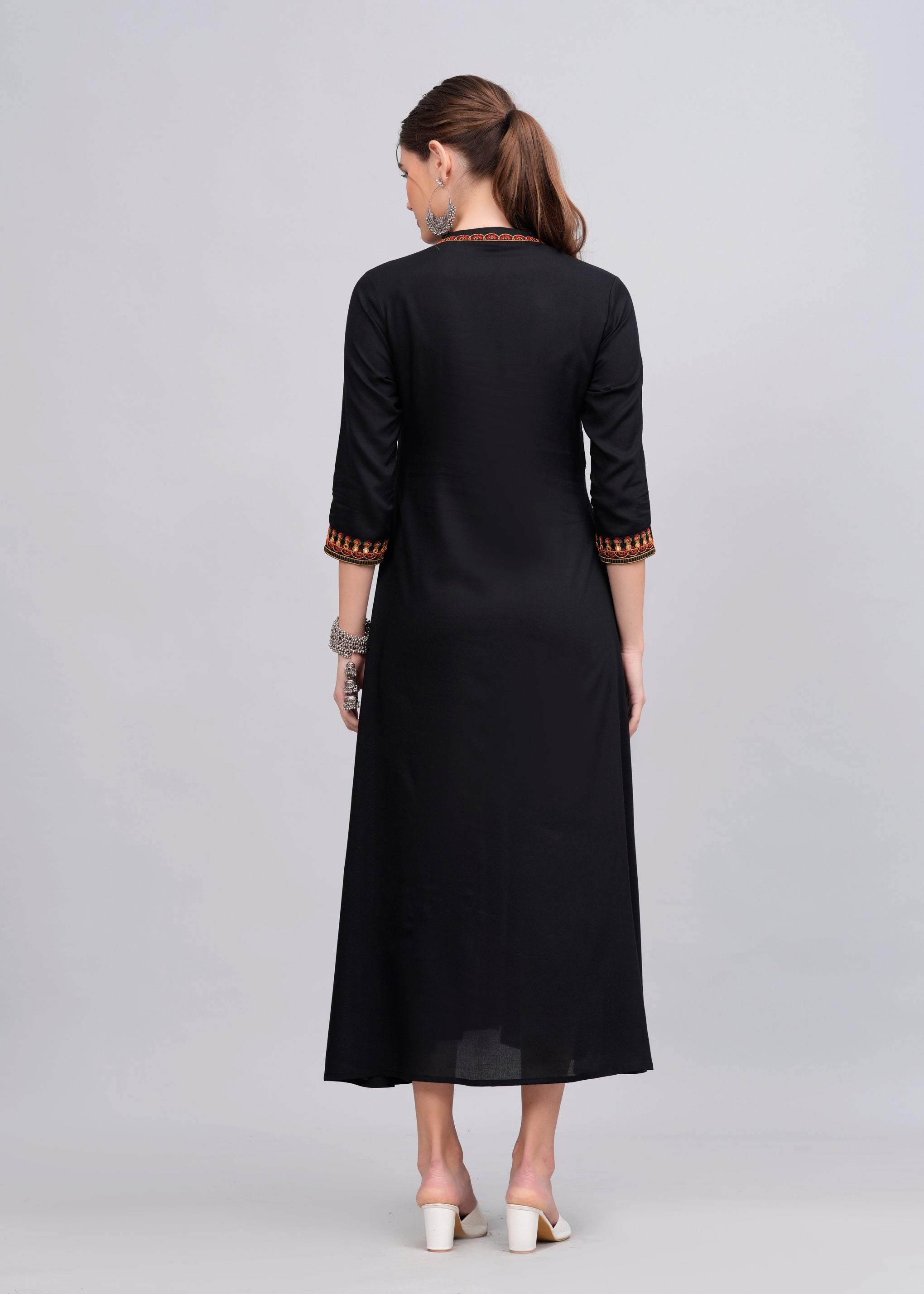 Elegant and timeless, this A-line midi dress features intricate ethnic embroidery that adds a rich traditional touch. Designed with a graceful layered silhouette, it offers a flattering fit perfect for festive gatherings and special occasions.