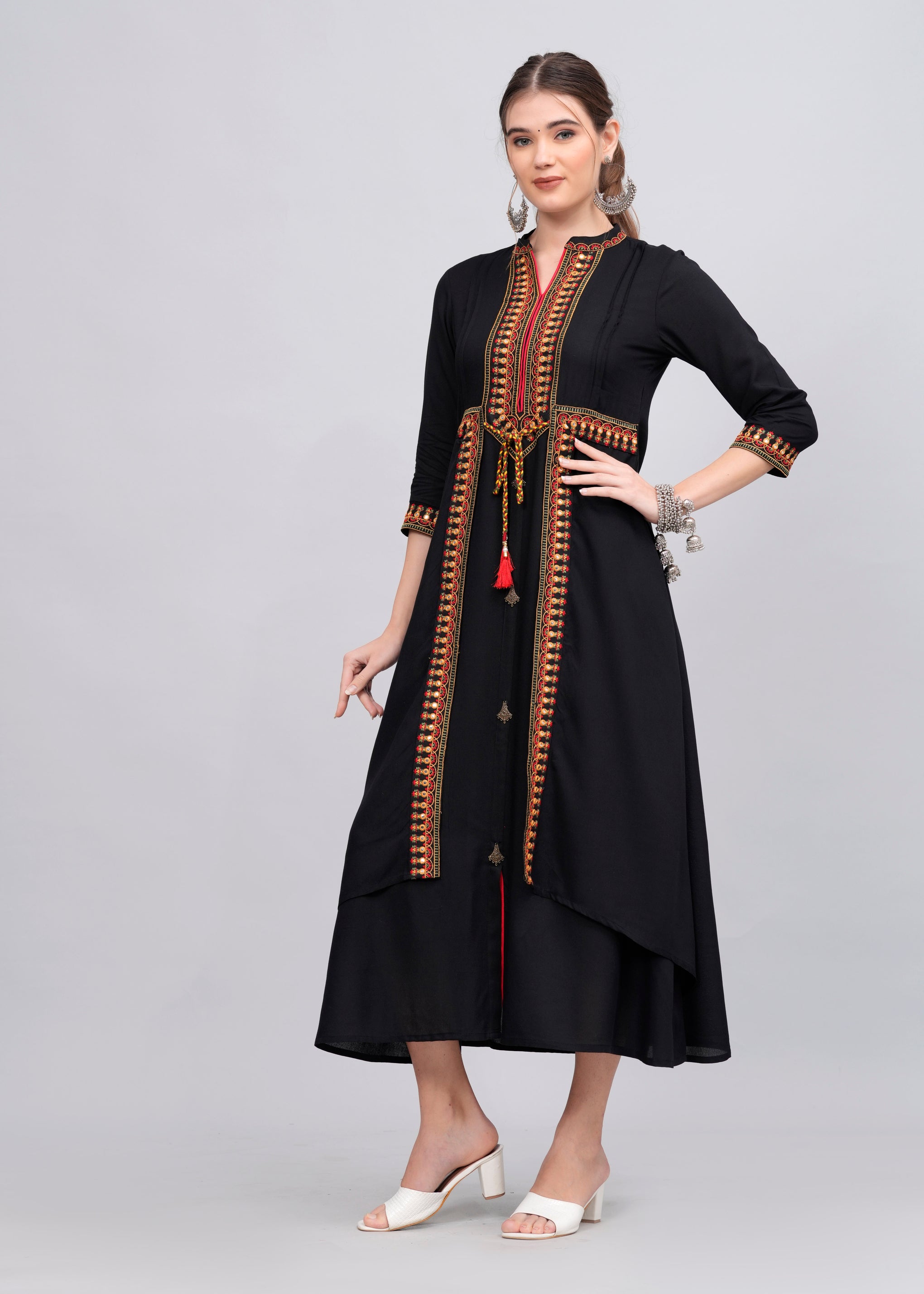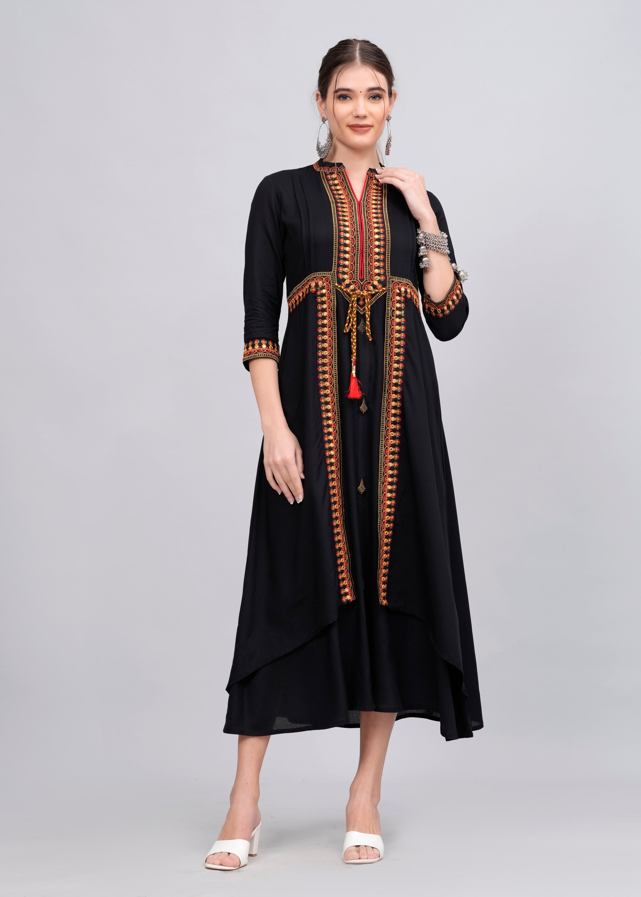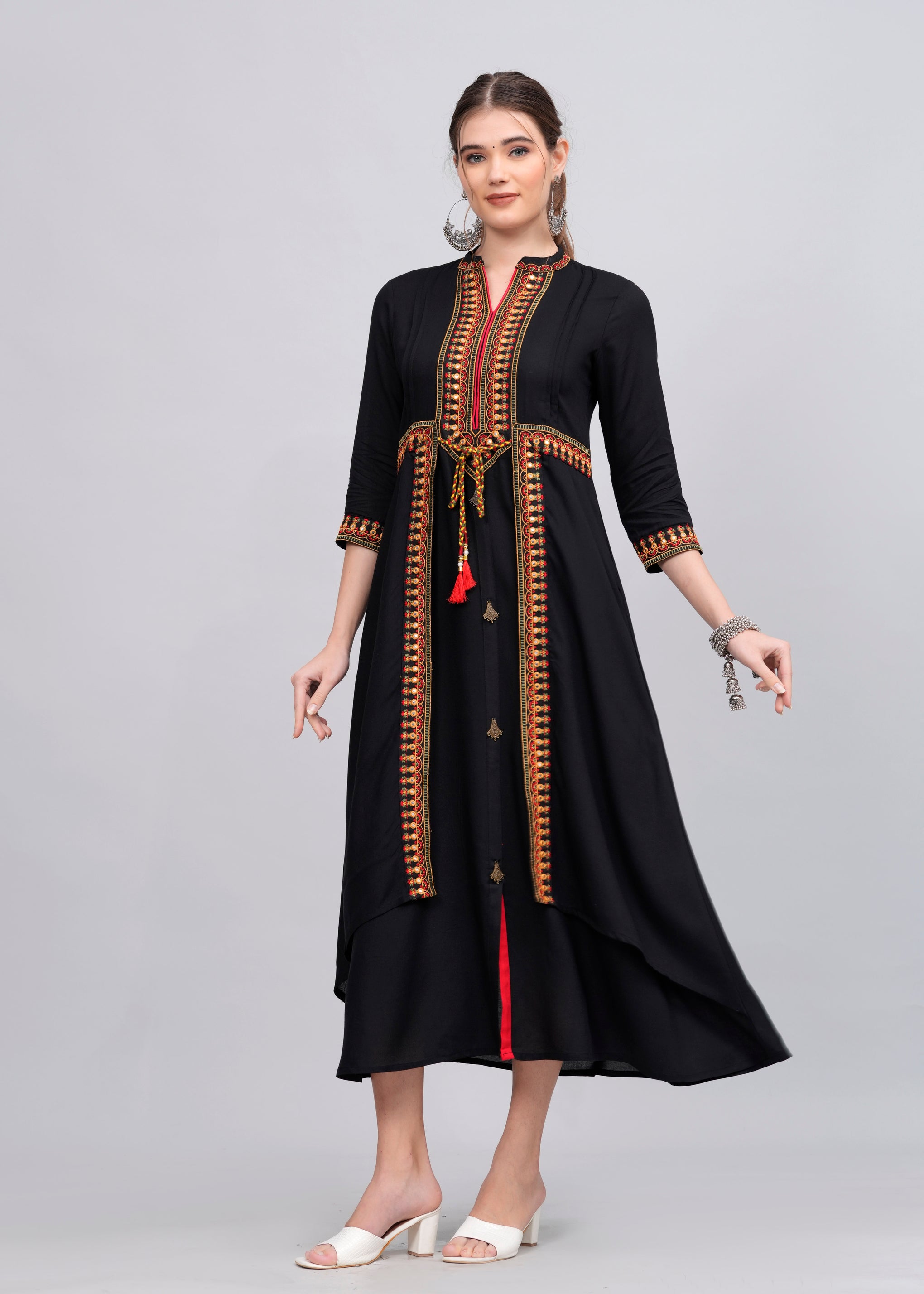 Key Features• Elegant ethnic embroidered detailing• Flowy A-line layered midi silhouette• Comfortable and breathable fabric• Stylish three-quarter sleeves with embellished borders• Ideal for festive occasions and ethnic celebrations