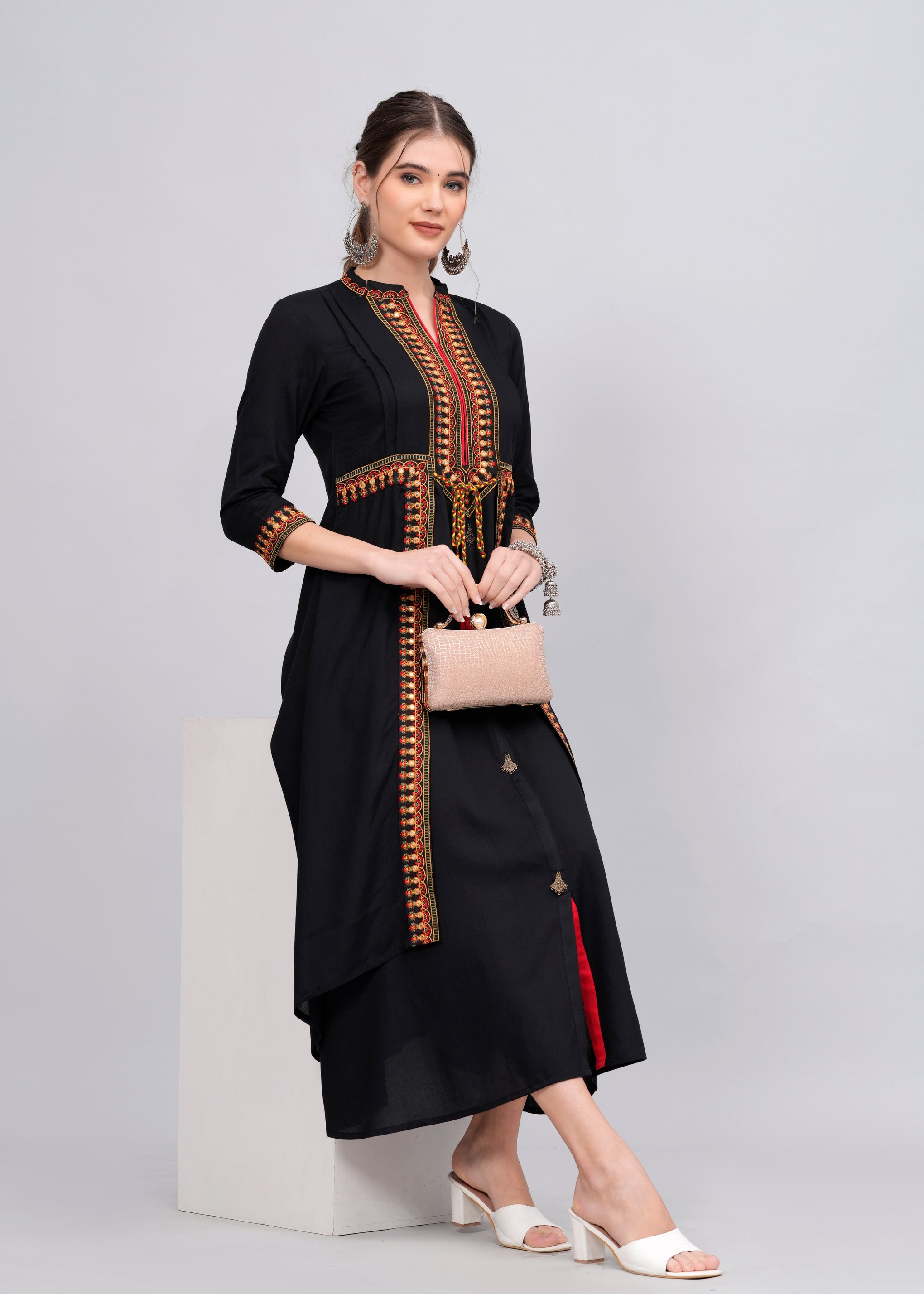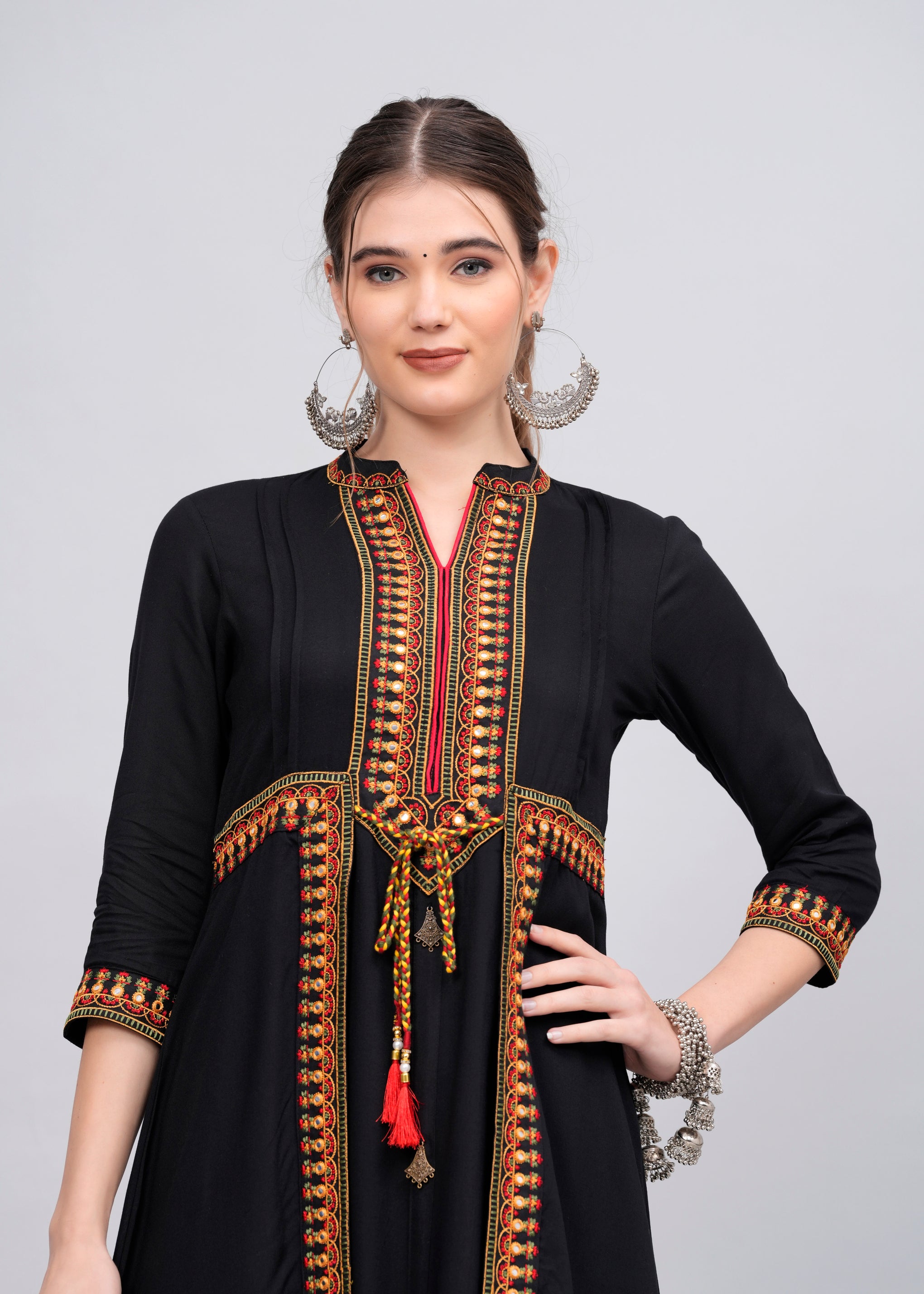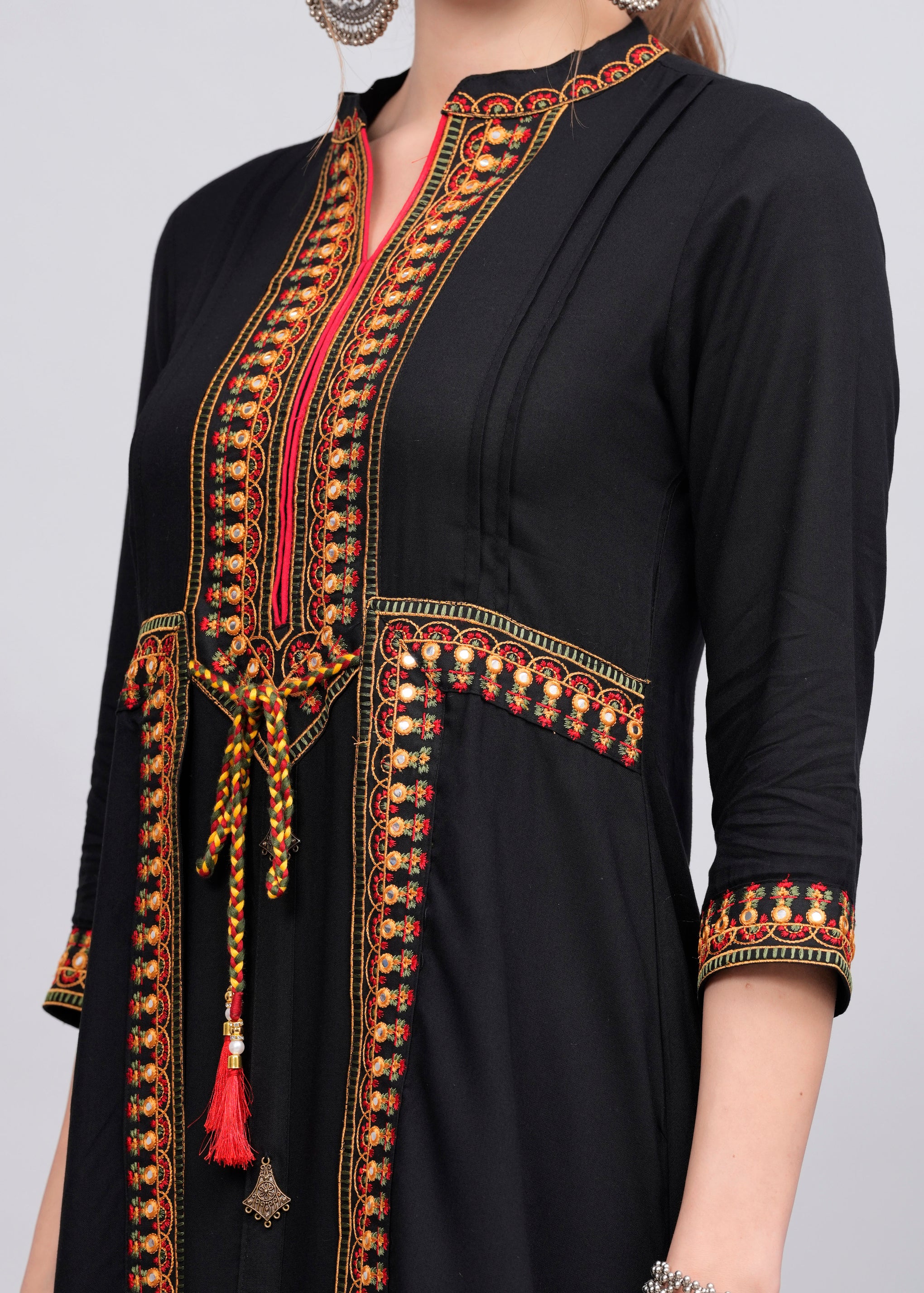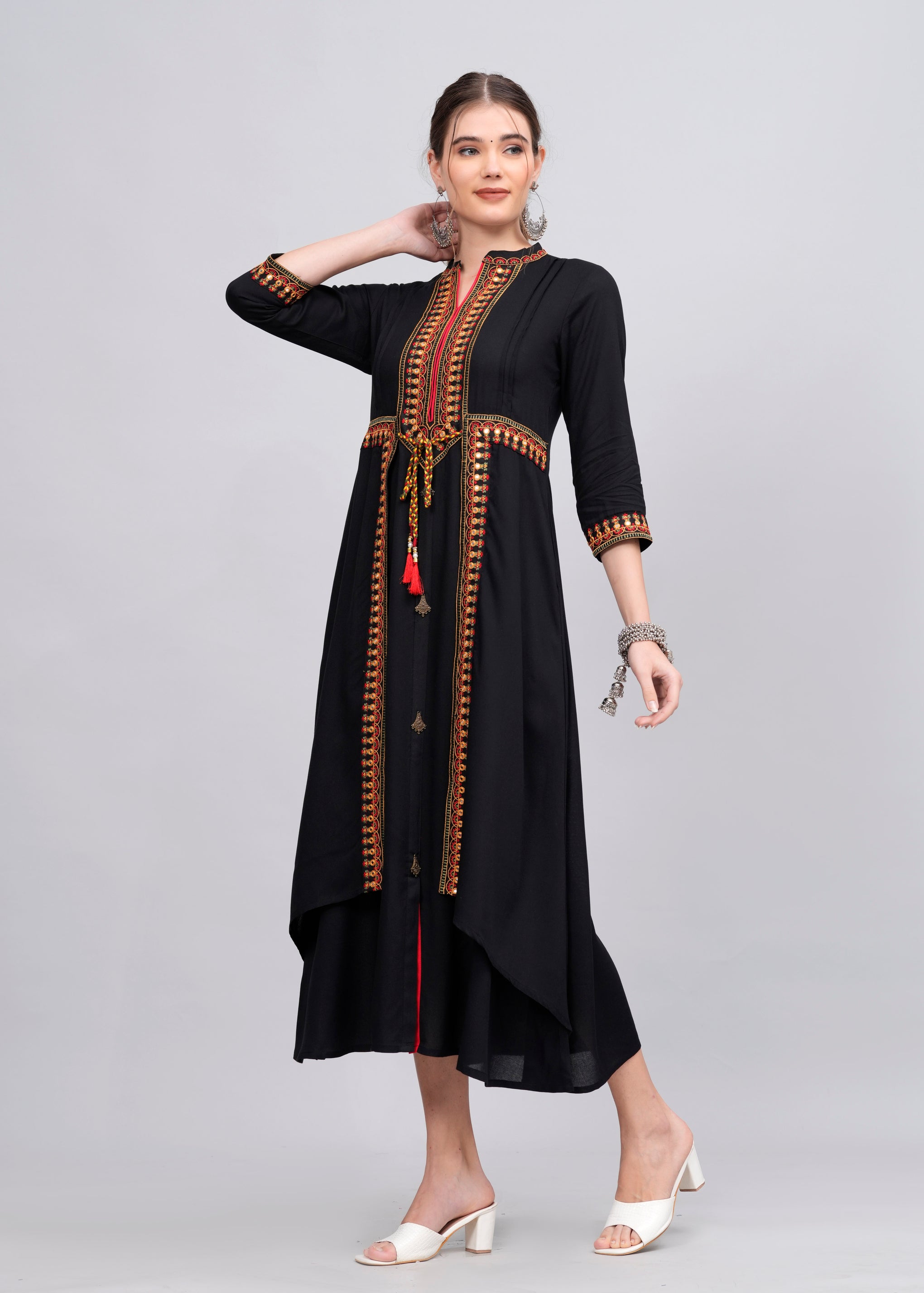 Key Features• Elegant ethnic embroidered detailing• Flowy A-line layered midi silhouette• Comfortable and breathable fabric• Stylish three-quarter sleeves with embellished borders• Ideal for festive occasions and ethnic celebrations