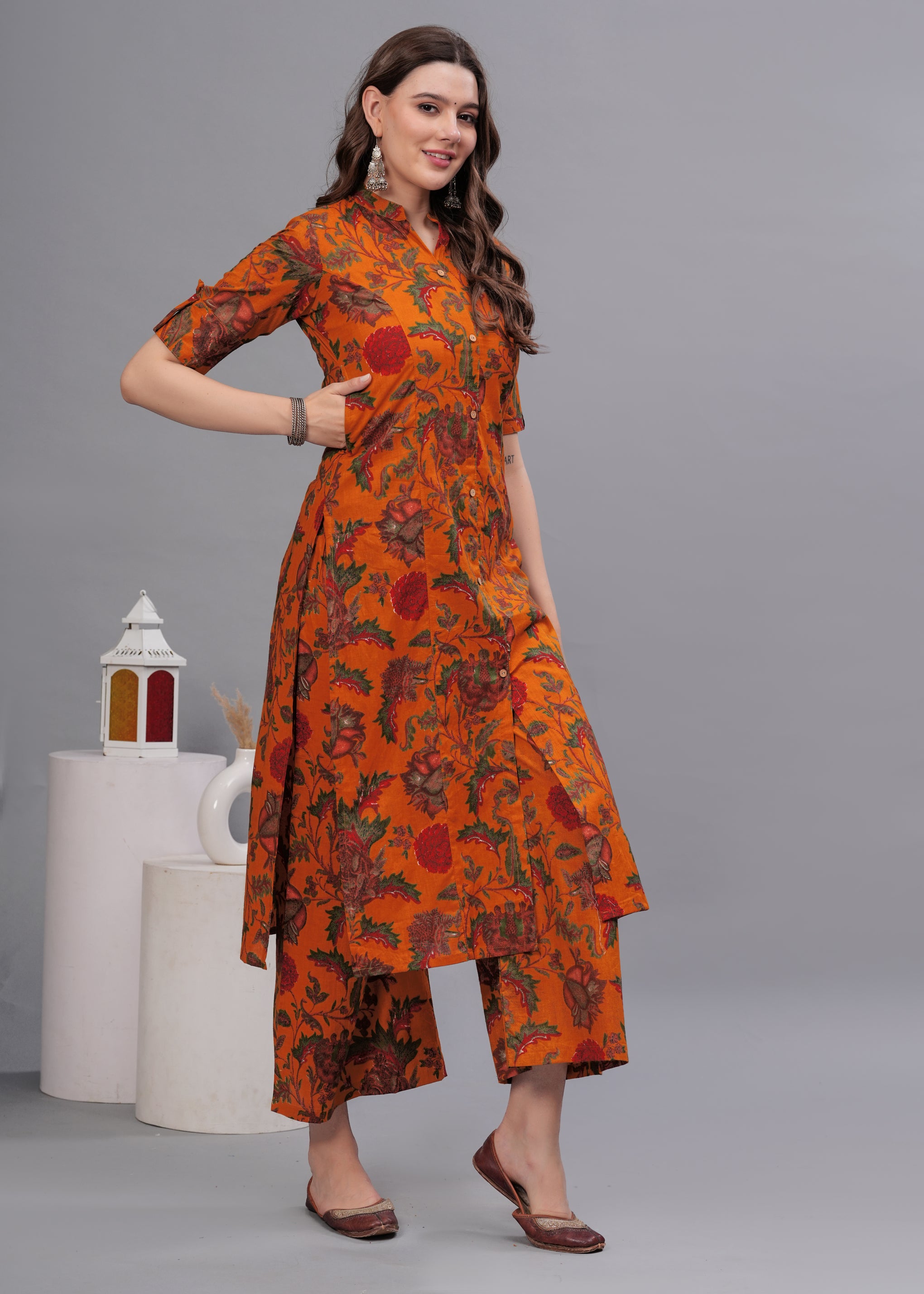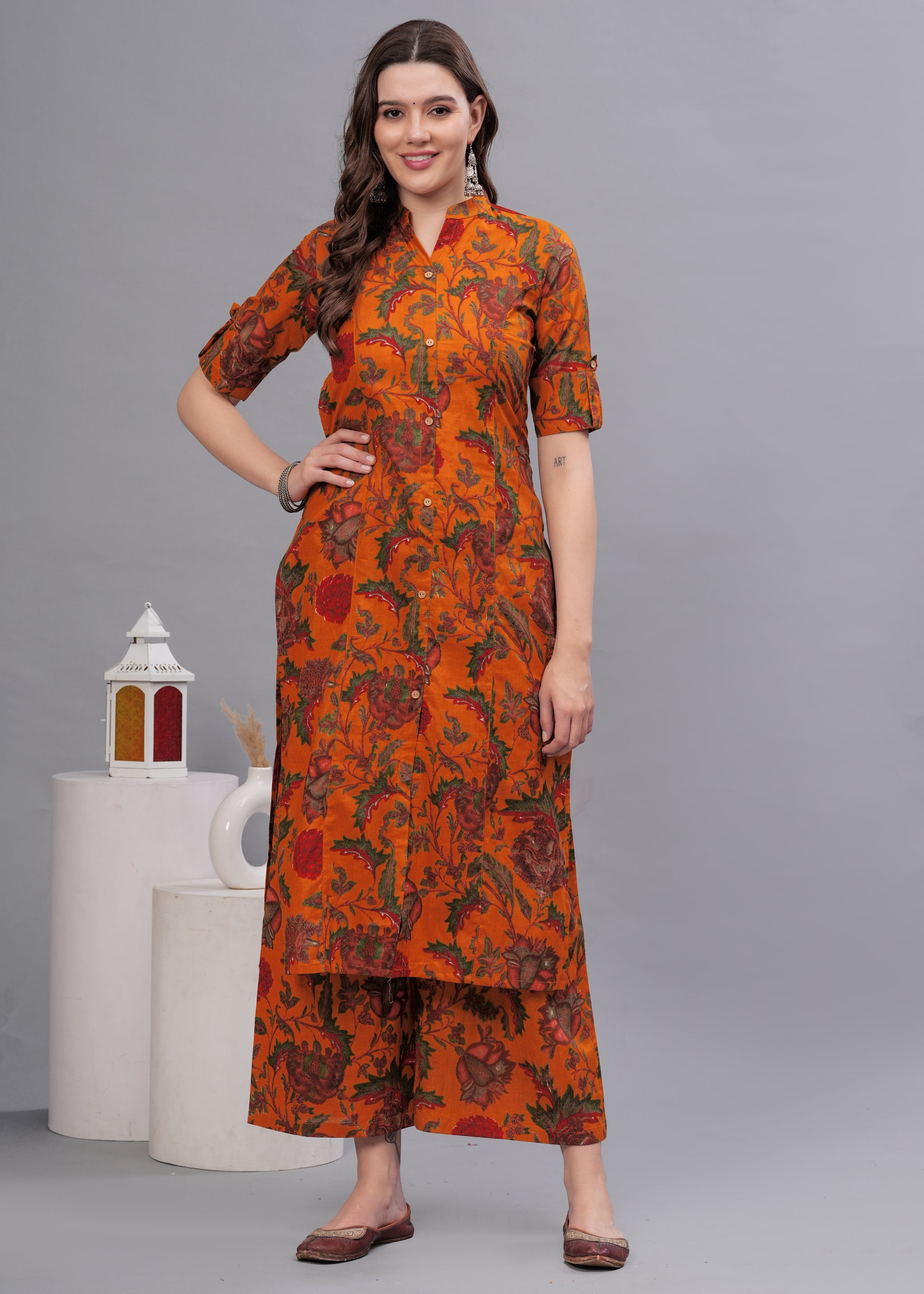 A vibrant floral printed kurta set crafted from pure cotton for all-day comfort. The kurta features a mandarin collar with a button-down front and is paired with matching palazzos for an elegant everyday ethnic look.