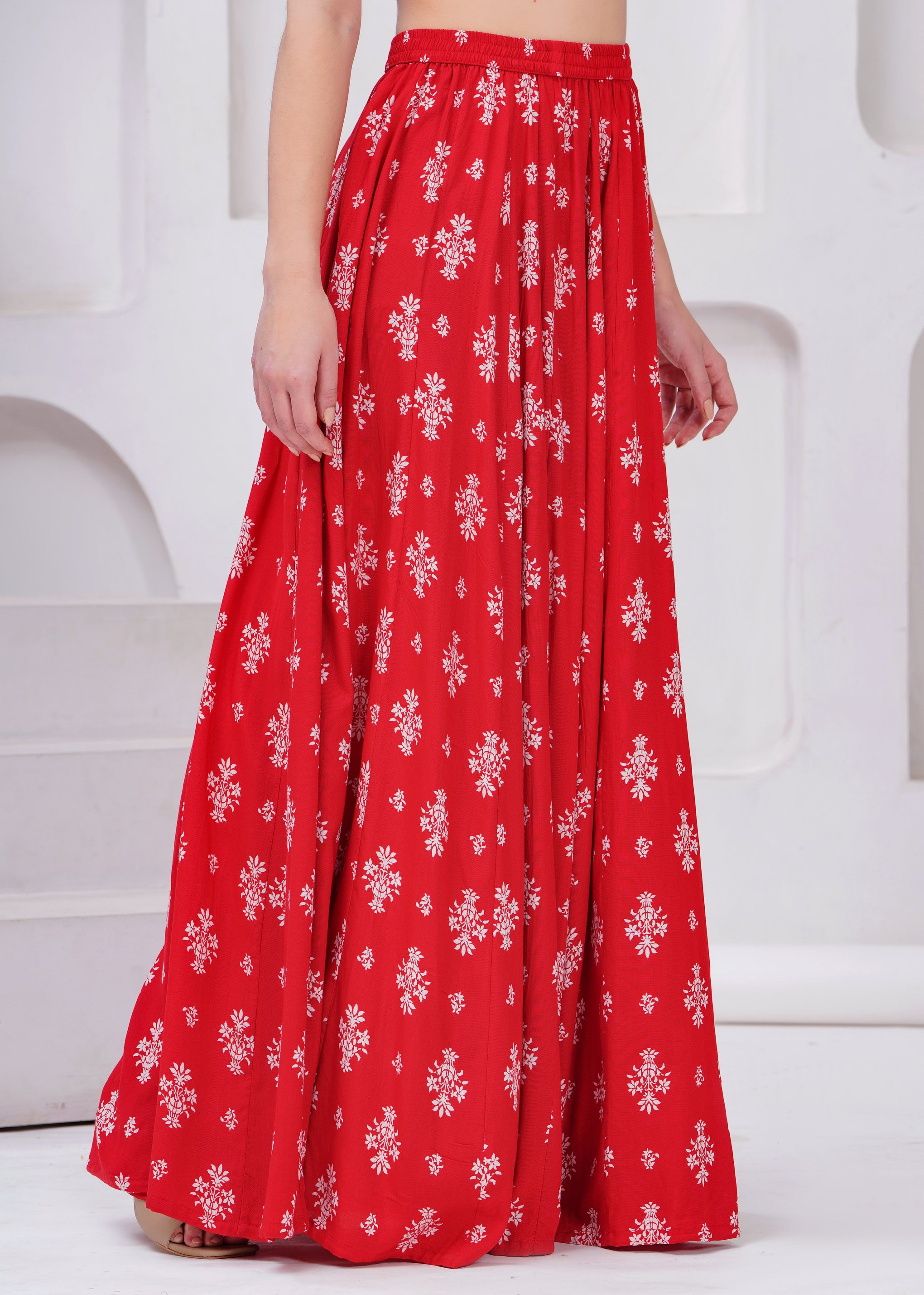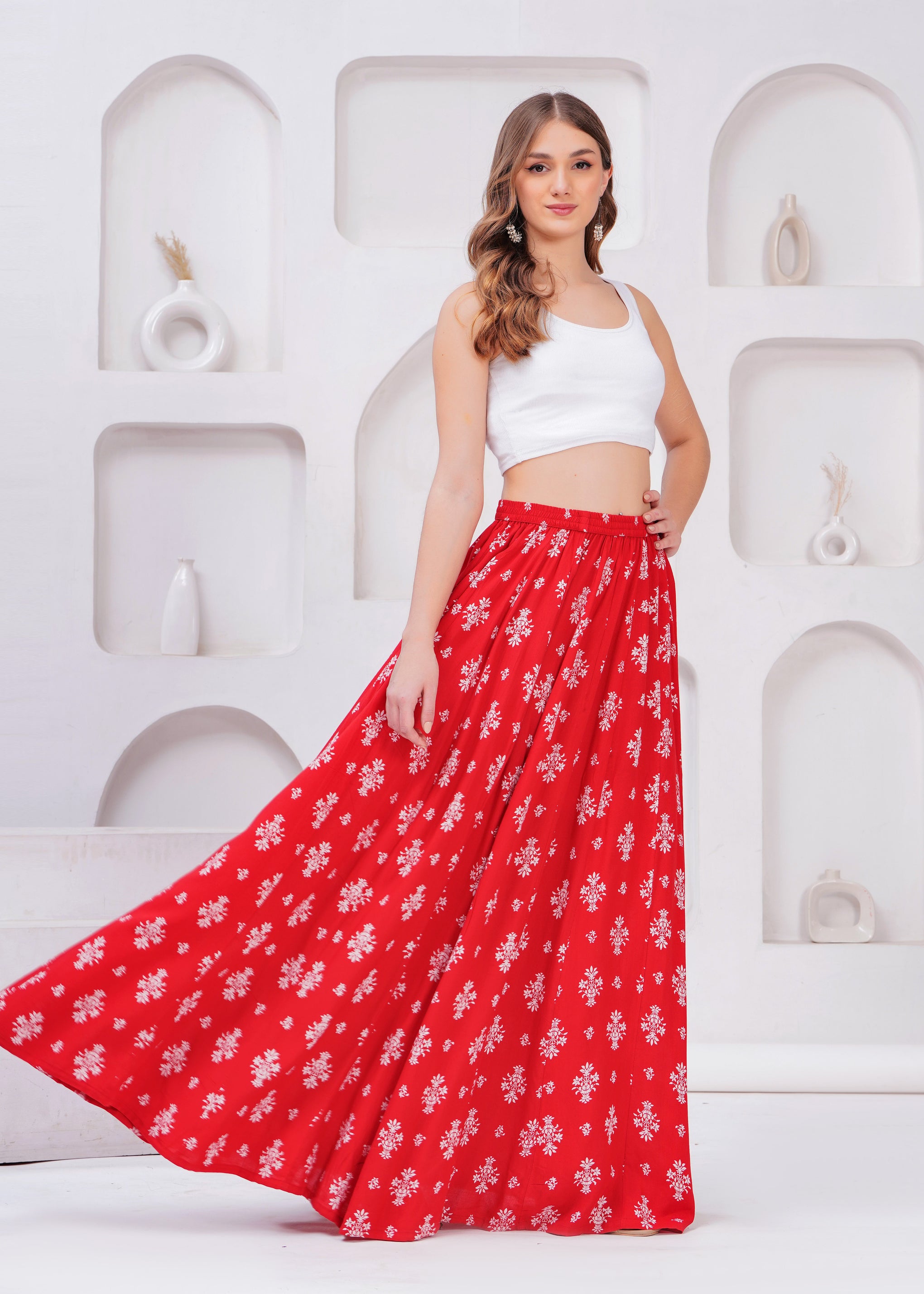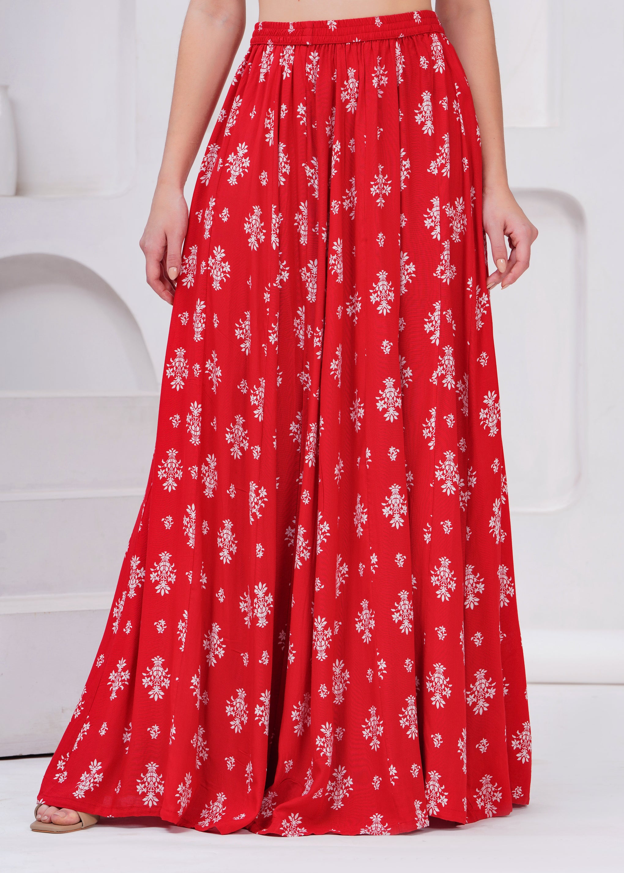 A stylish flared maxi skirt designed with an elegant all-over printed pattern that adds charm to your ethnic wardrobe. The flowing silhouette offers graceful movement, while the soft fabric and elasticated waistband ensure all-day comfort. Perfect for pairing with crop tops, kurtas, or ethnic blouses for a chic traditional look.