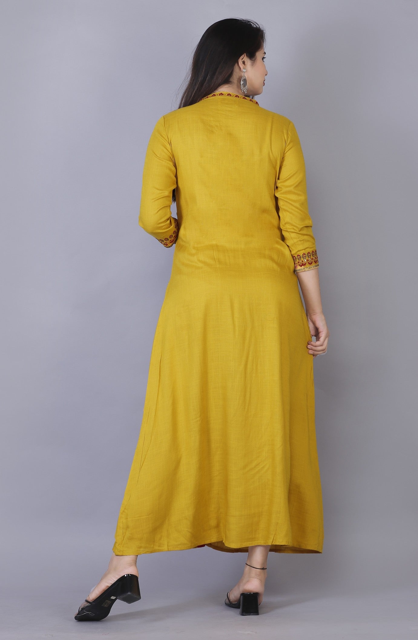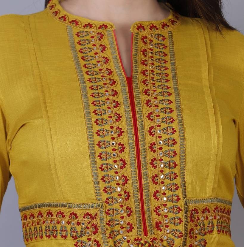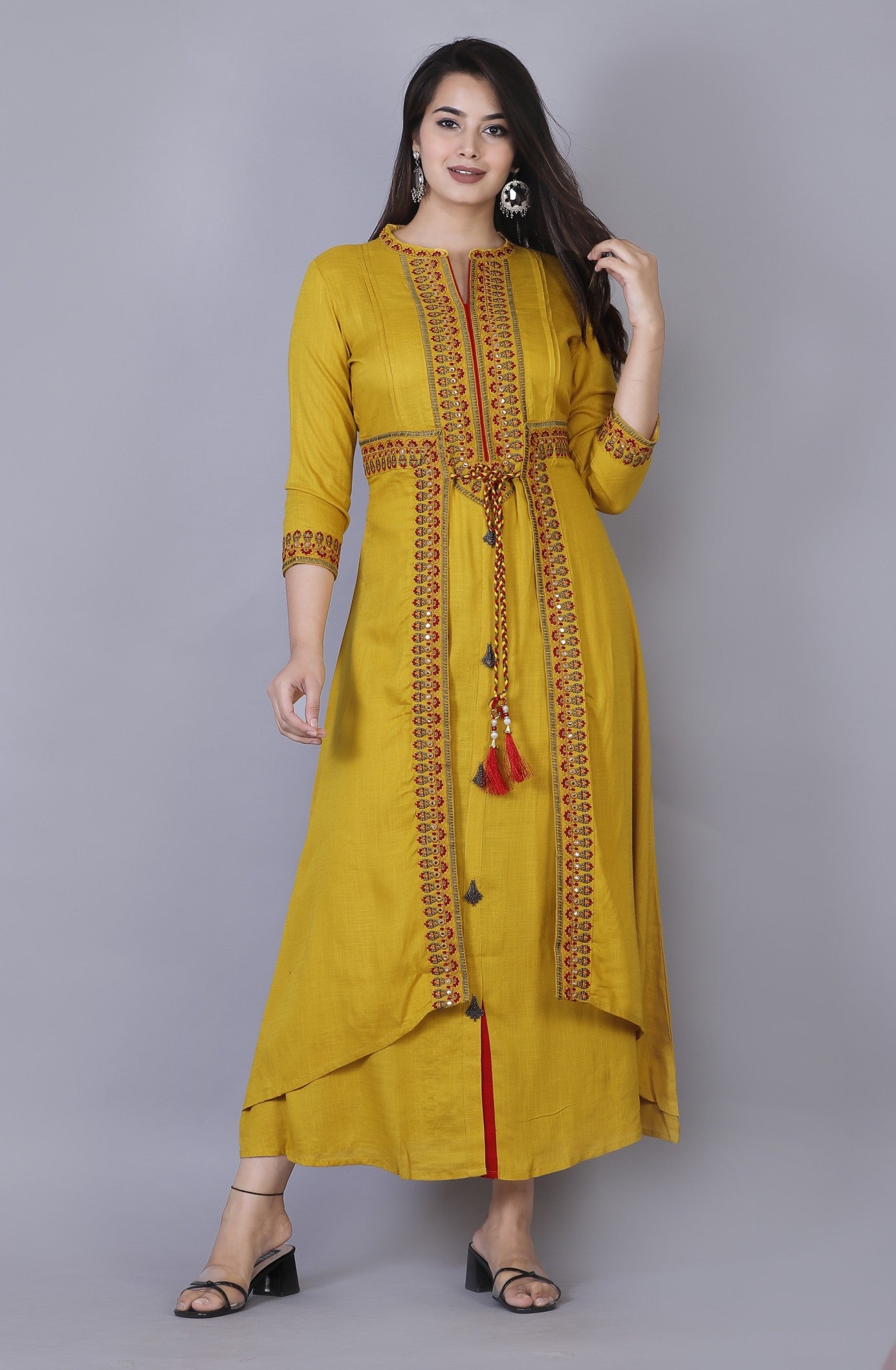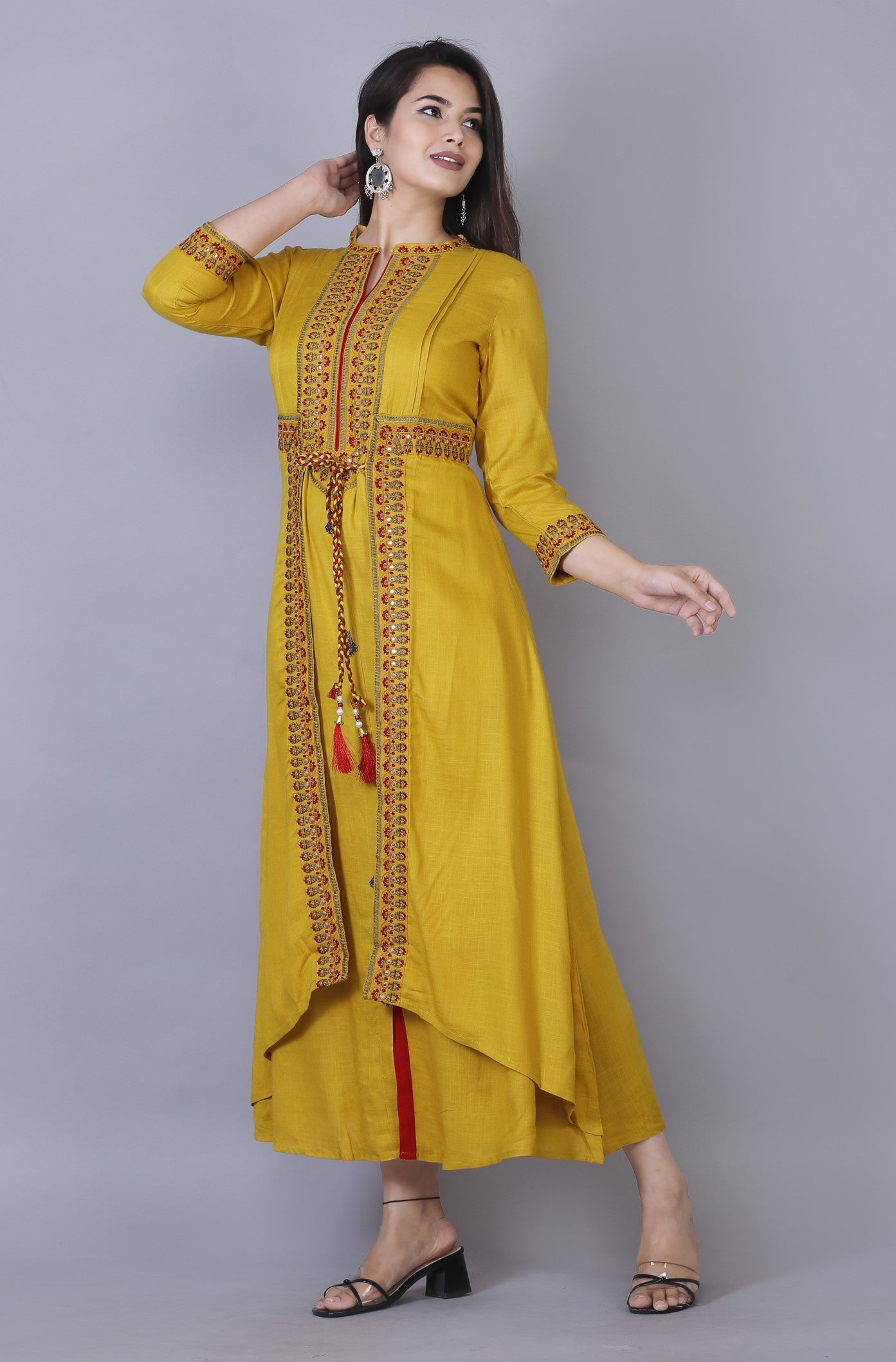 Radiate ethnic elegance with this beautifully designed layered kurta featuring intricate ethnic motif embroidery and delicate mirror work detailing. Crafted in a flattering silhouette with tassel accents, it offers a perfect blend of traditional charm and contemporary style.